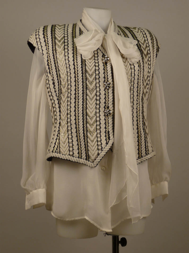 LOTTO - LOT gilet ricamato in lana e filo dorato, Valentino Boutique, impreziosito da bottoni gioiello ed una camicia in voile di seta bianca, Valentino Miss V tg M circa, tg 46/12 (2)