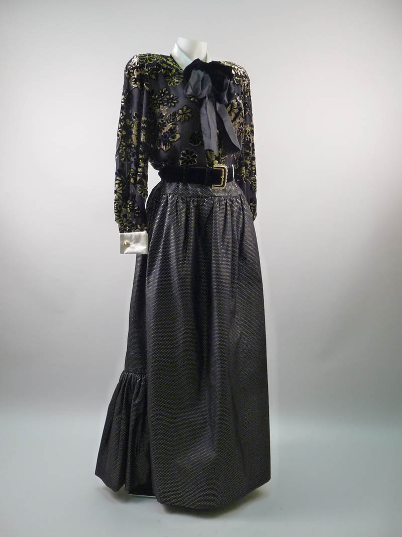 COMPOSÈ DA SERA - NIGHT COMPOSÈ Valentino Night camicia con bottoni gioiello e motivi floreali oro, due fiocchi neri di cui uno in velluto, gonna a pois dorati, baschina arricciata, tasche a taglio, ampia balza sul retro, cintura in velluto nero con fibbia gioiello ornata da strass tg M circa (come lotto precedente) (4)