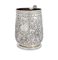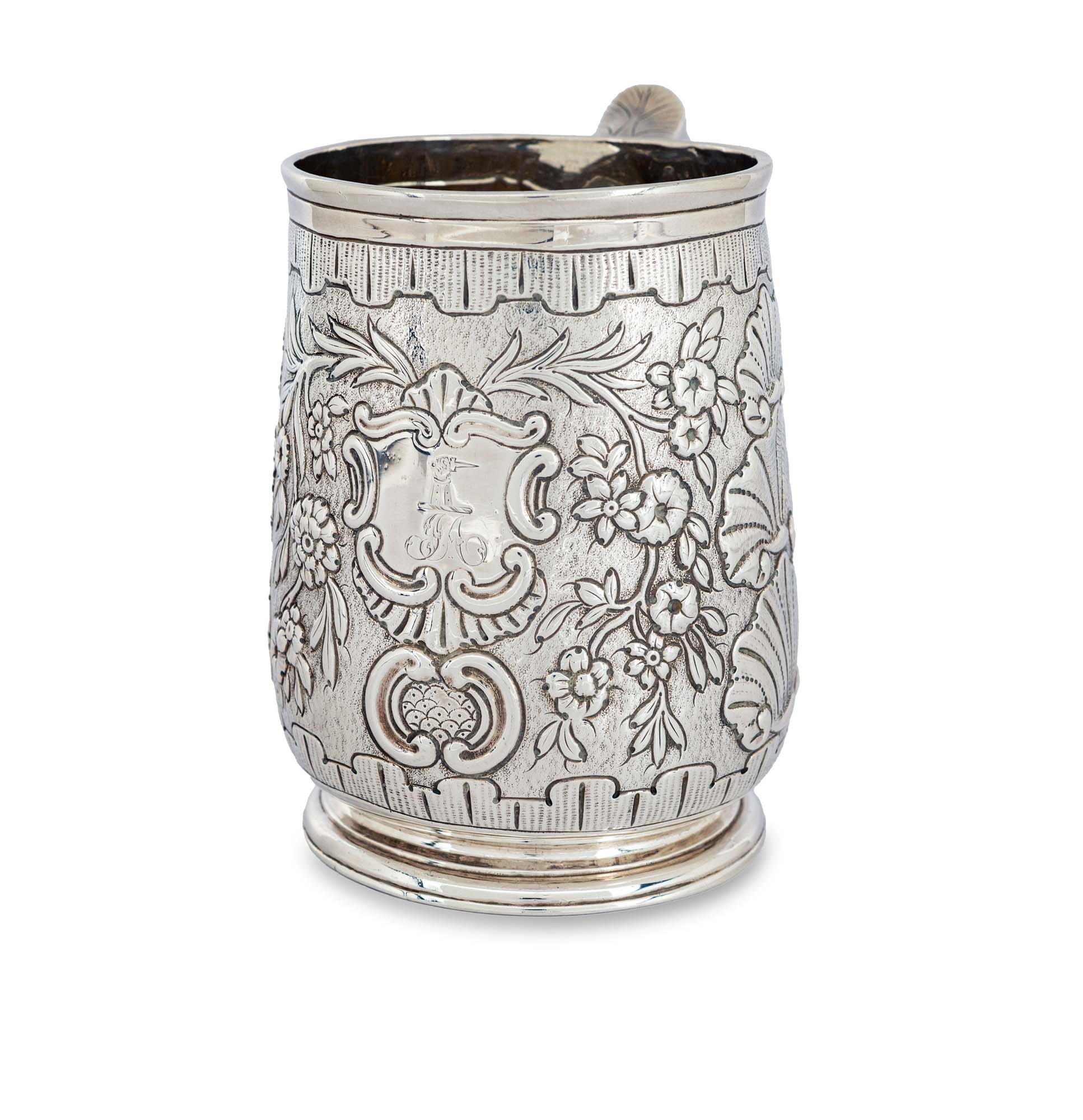 Boccale in argento sbalzato, Londra Giorgio I, 1720 decorato da tre ordini di valve disposte in colonna a scalare, alternate a tralci con fiori multiformi; manico sagomato, basso piede ad anello cm 12x13x8 - gr. 352 - la scatola cm 17x18x14