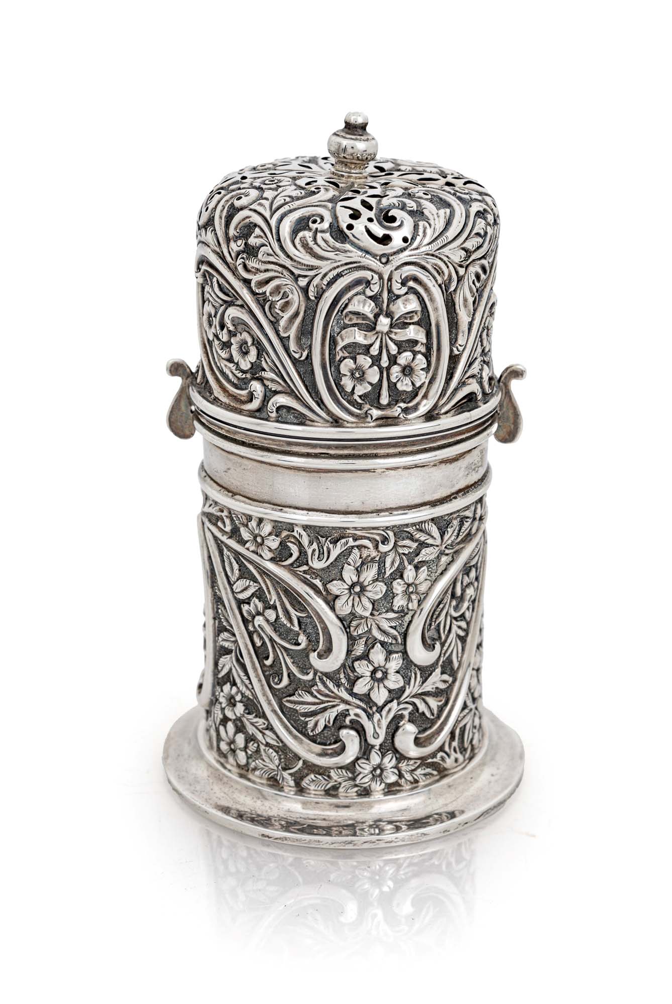 Spargizucchero in argento 925/000, Londra 1897 corpo cilindrico con fitta decorazione sbalzata a fiori e motivi vegetali; coperchio con chiusura a ... cm 12,5x6,5 - gr. 126
