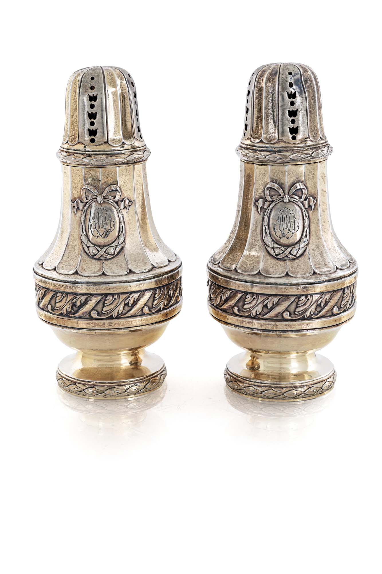 Coppia di grandi spargizucchero in argento, Parigi, prima metà del XIX secolo corpo a balaustro caratterizzato da una fascia percorsa da foglie d'acanto cesellate alternate a nastri e personalizzato da iniziali entro corona di foglie sorretta idealmente da un fiocco; coperchio con chiusura a vite altezza cm 18 - gr. 440