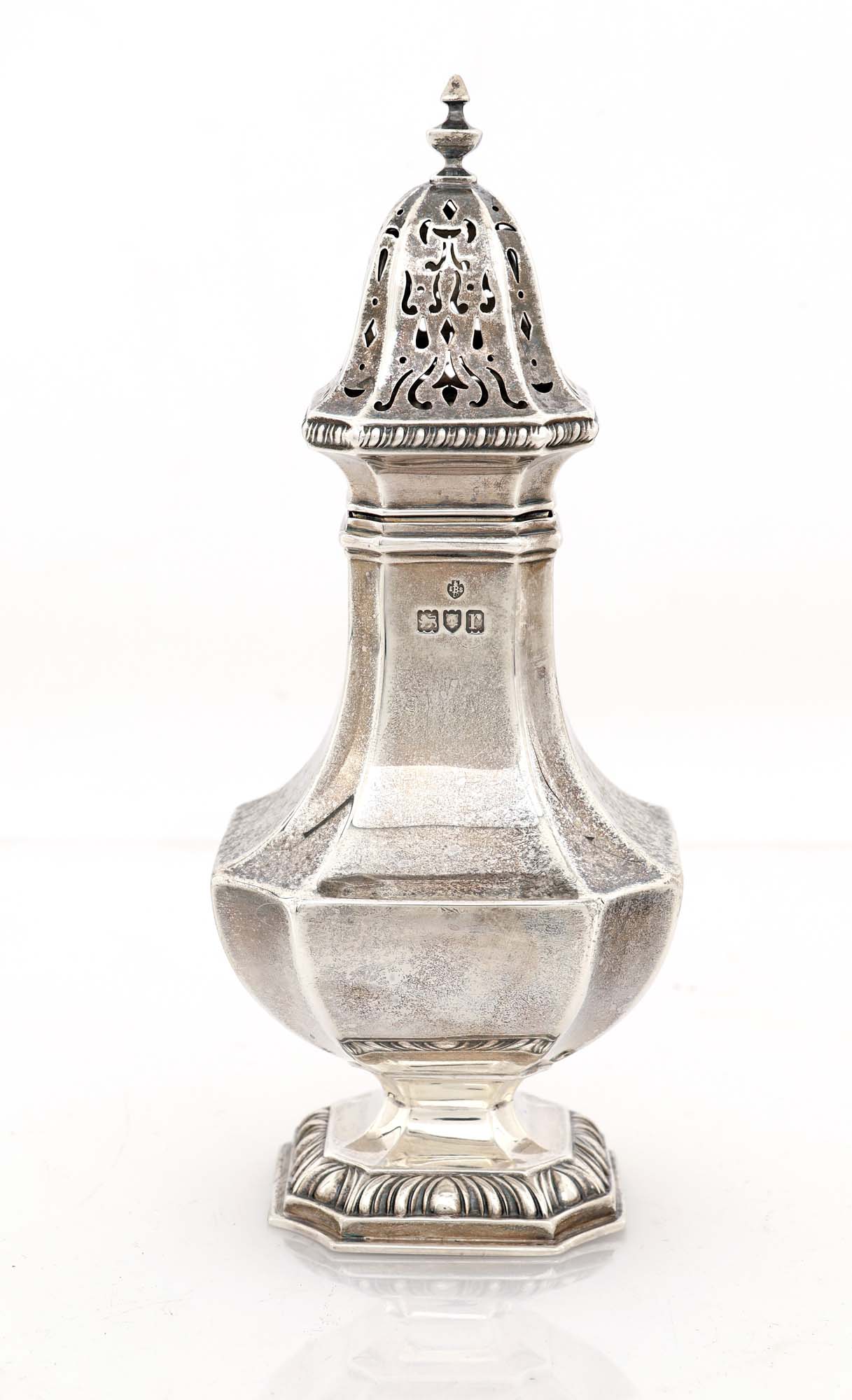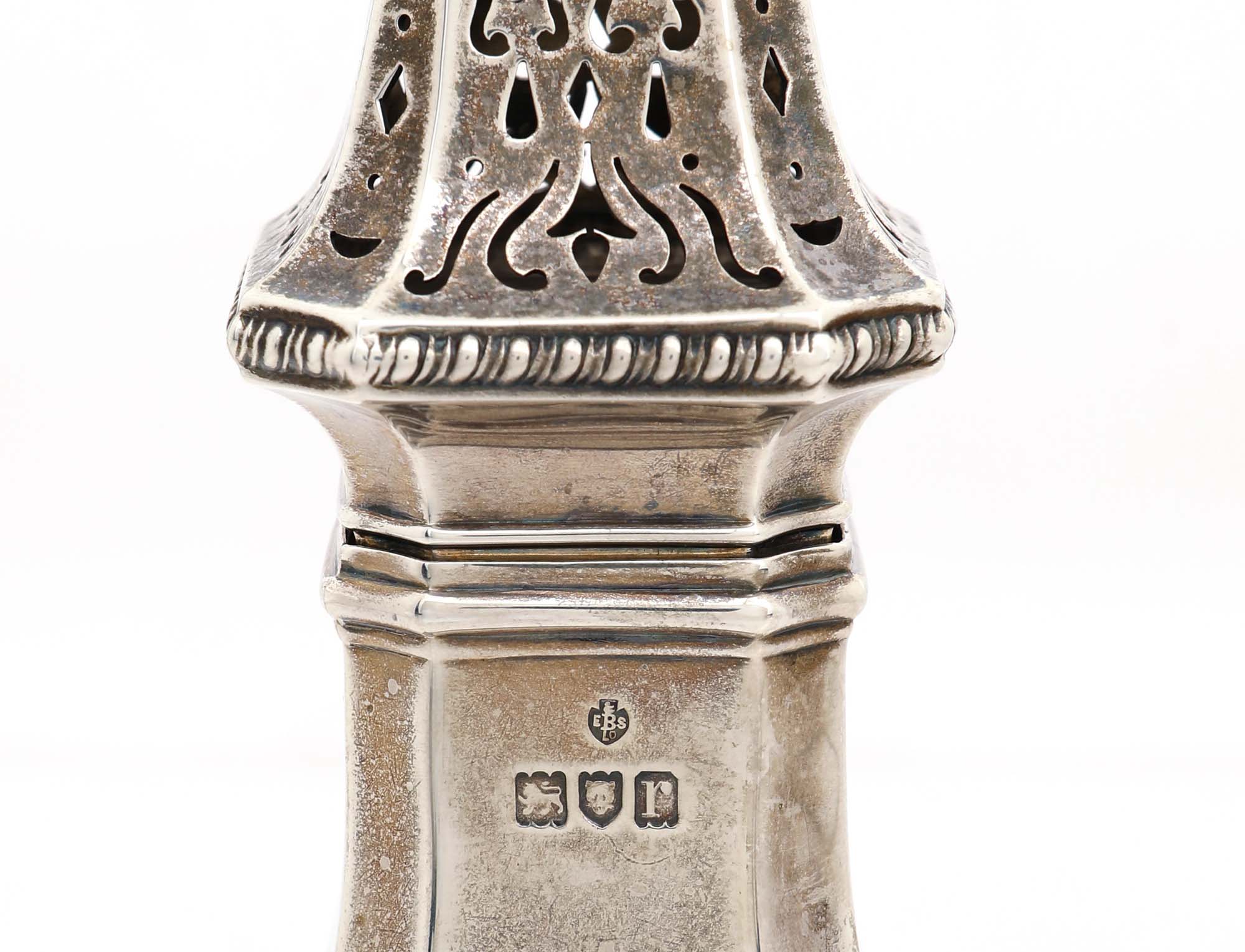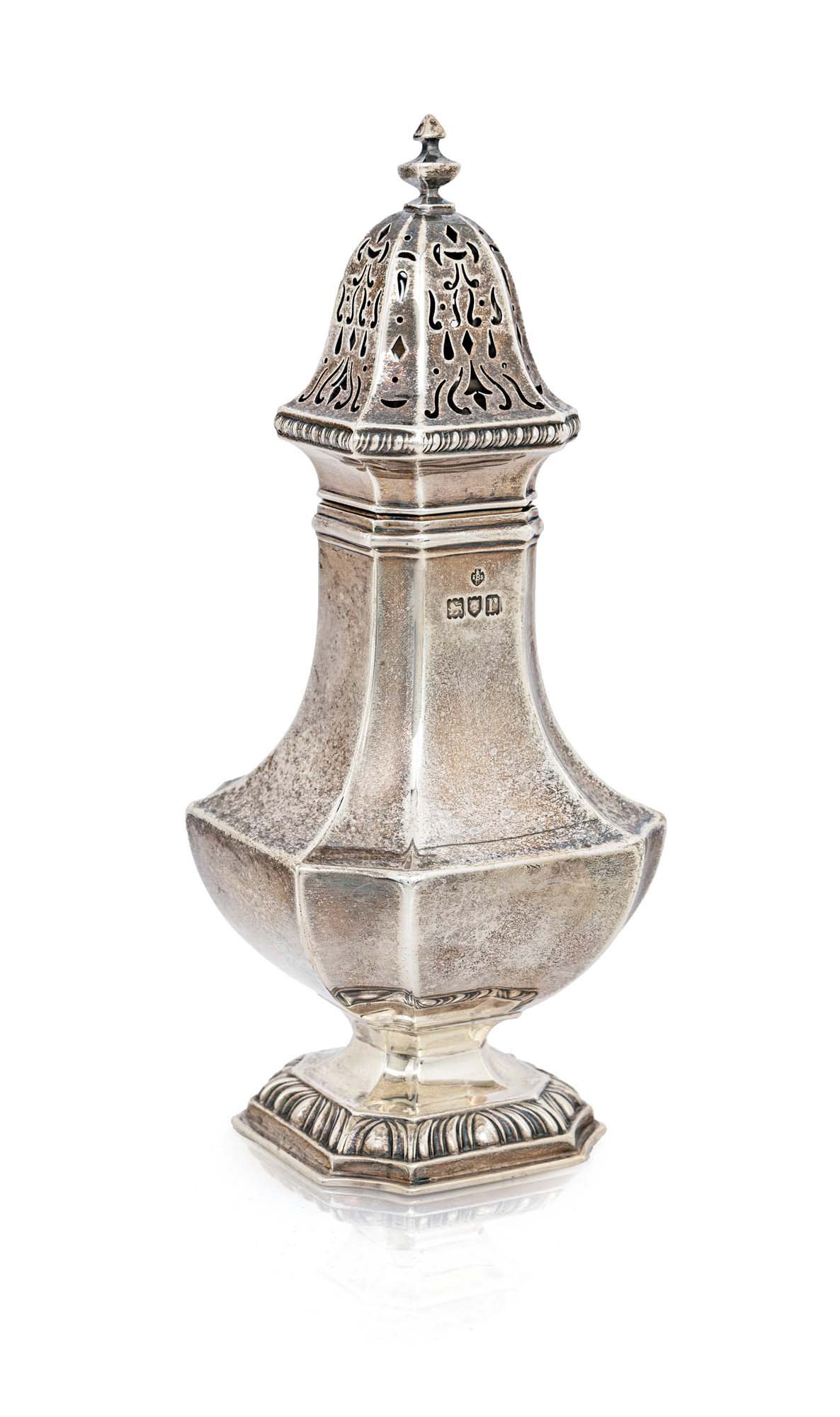 Grande spargizucchero in argento, Londra 1912 corpo a balaustro squadrato con...