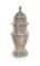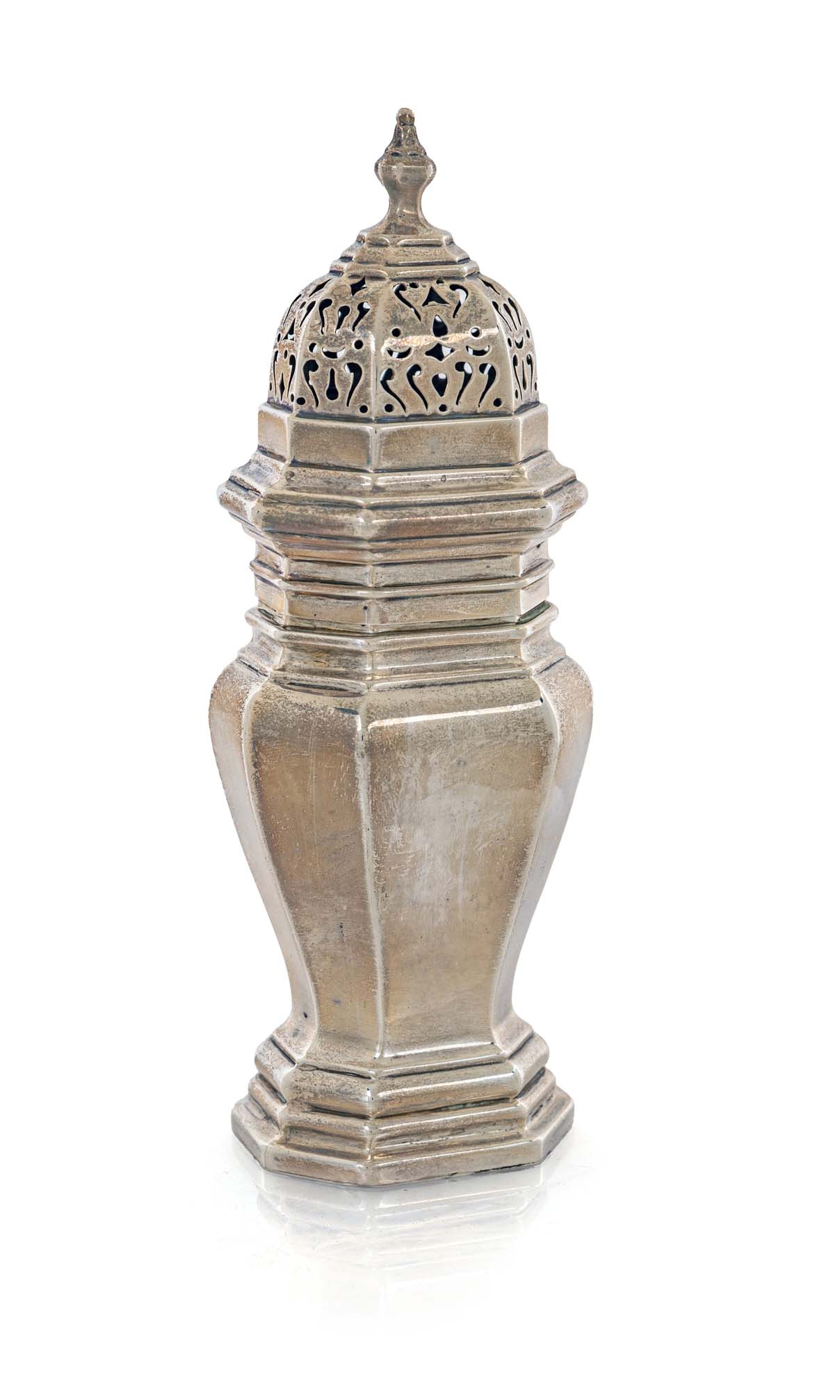 Grande spargizucchero in argento, Londra 1928, argentiere Mappin & Webb corpo a balaustro poliedrico su base gradinata, cope4chio traforato sormontato da pinnacolo altezza cm 20,5 - gr. 244