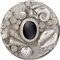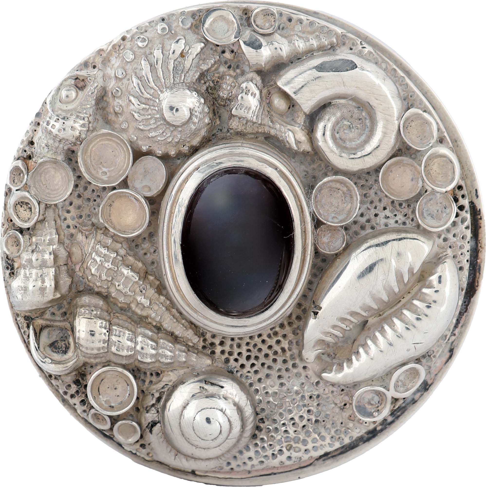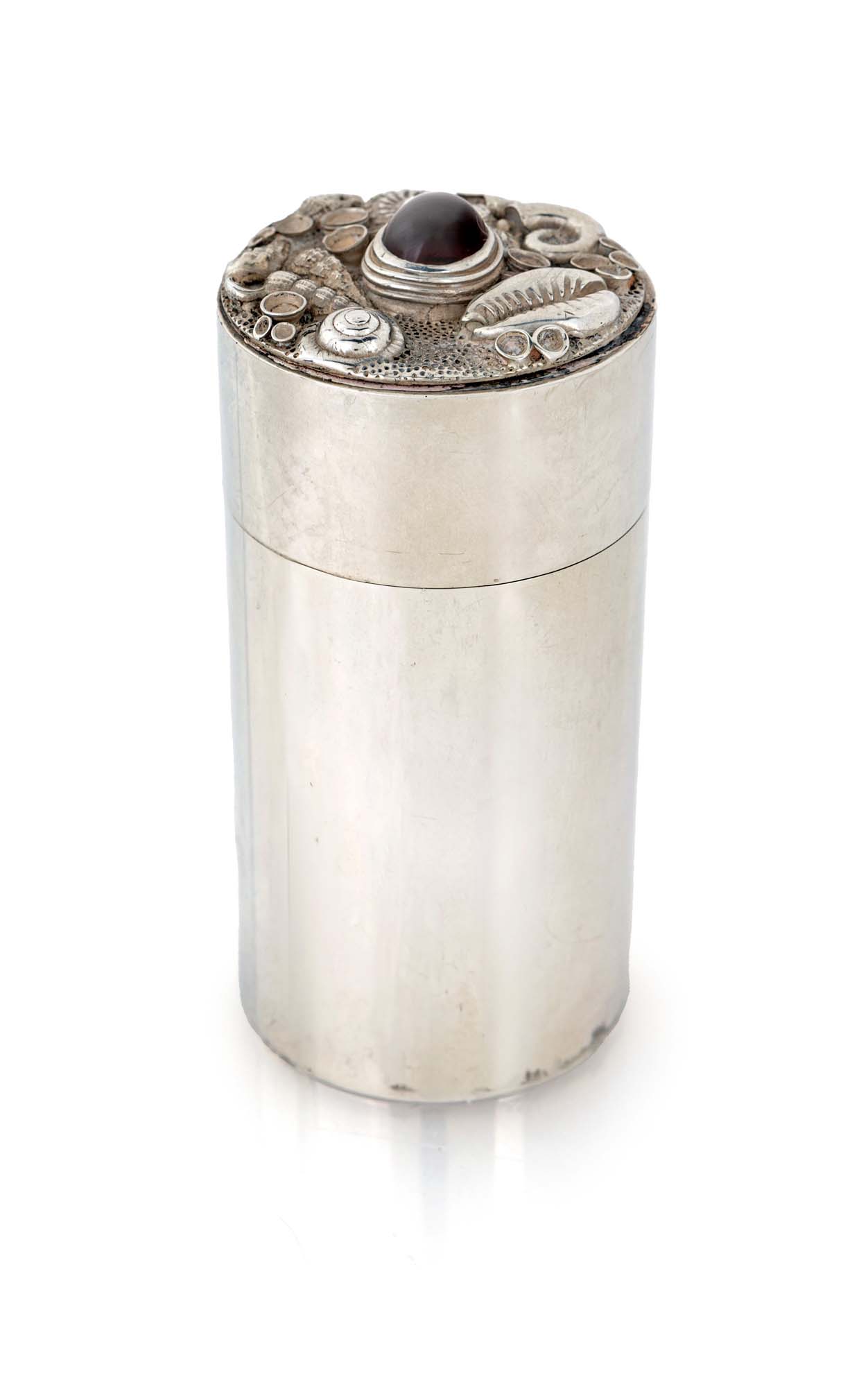 Scatola portatè in argento 925/000, Londra 1976, argentiere Jocelin Buston corpo cilindrico con coperchio sormontato da un trofeo di conchiglie multiformi centrato da un'ametista cabochon altezza cm 10,5x5 - gr. 230 lordi