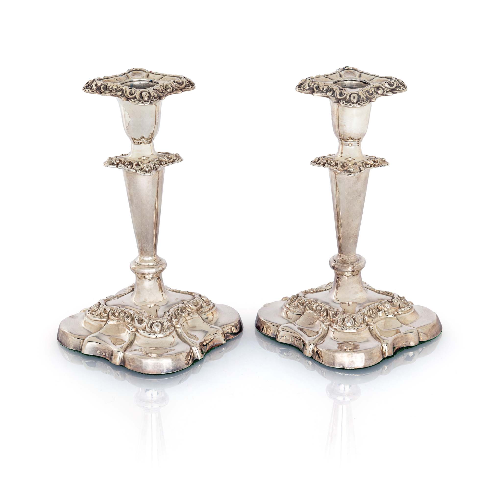 Coppia di candelieri in argento (appesantito), Birmingham 1900 caratterizzati da tre ordini di decorazione a volute sbalzate disposte lungo la bobèche, alla base del portacandela e sulla base altezza cm 18 - peso complessivo lordo gr. 900