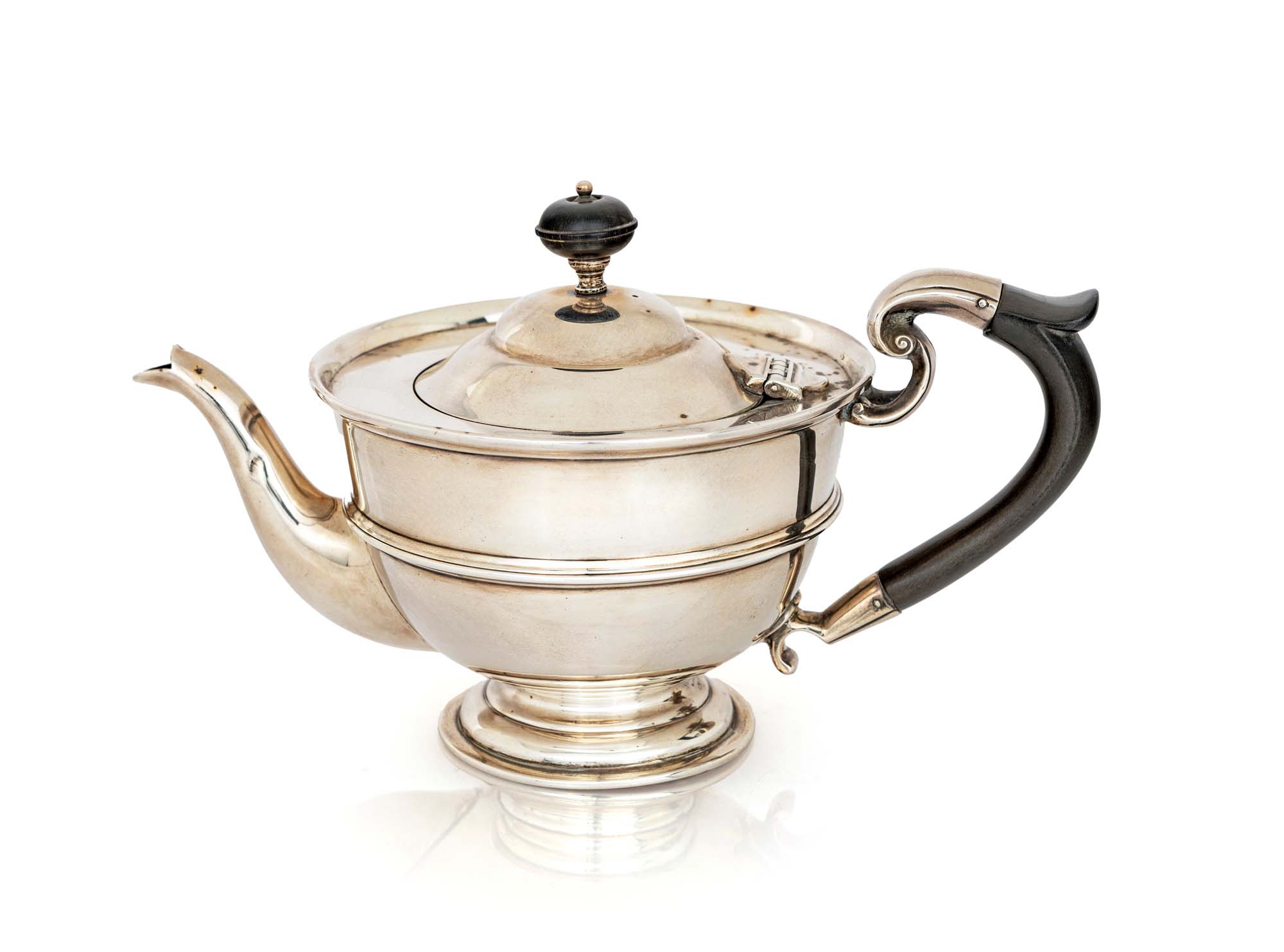 Teiera città di Sheffield 1916 corpo a forma di tazza con versatoio sagomato, piede circolare gradinato, coperchio a cupolino incernierato al centro della copertura superiore, pomolo e manico in legno cm 10,5x21x11,5 - peso lordo gr. 360