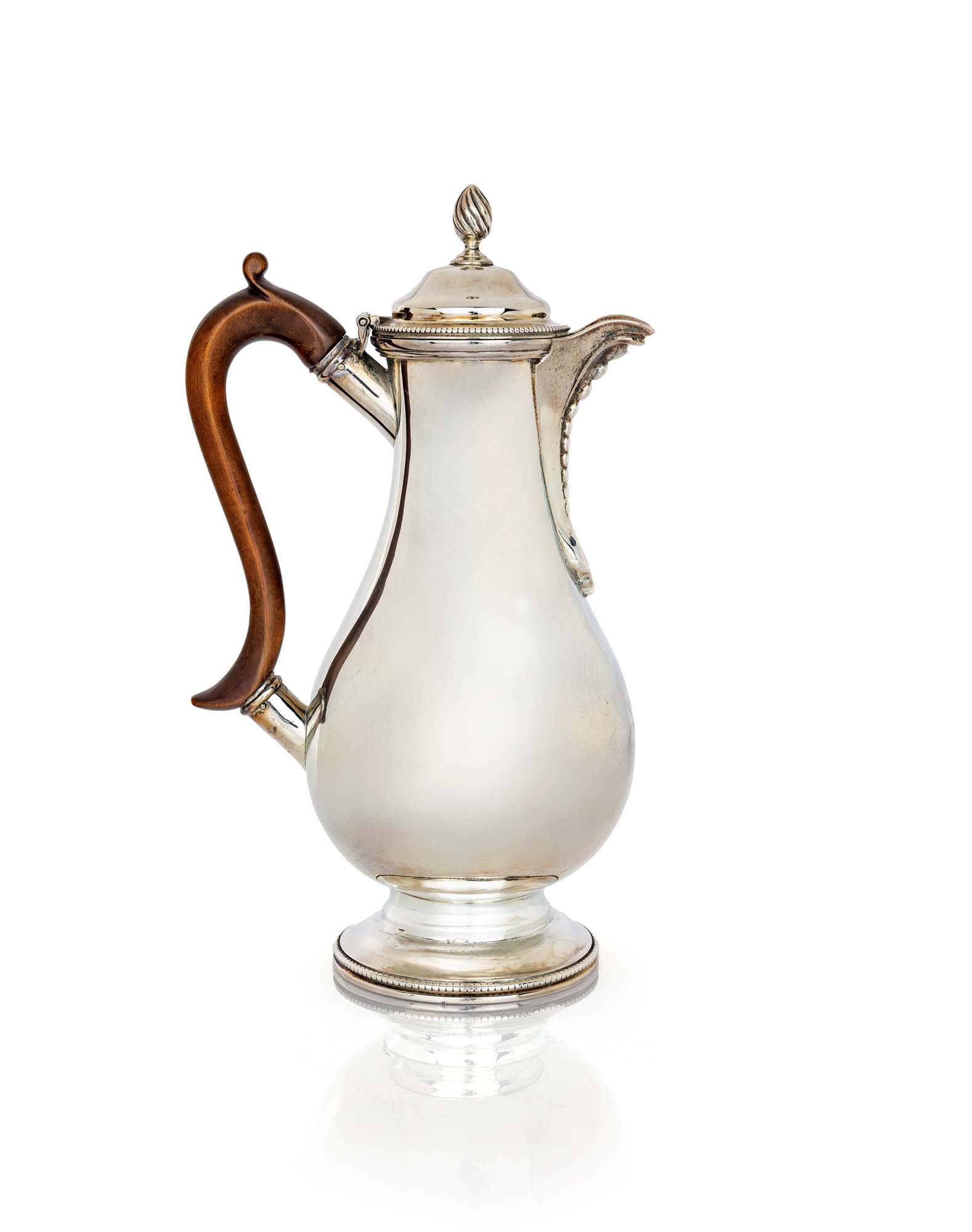Caffettiera Londra 1879 coperchio a cupolino incernierato, versatoio a becco con perline, manico sagomato in legno, piede circolare altezza cm 22,5 - peso lordo gr. 384