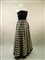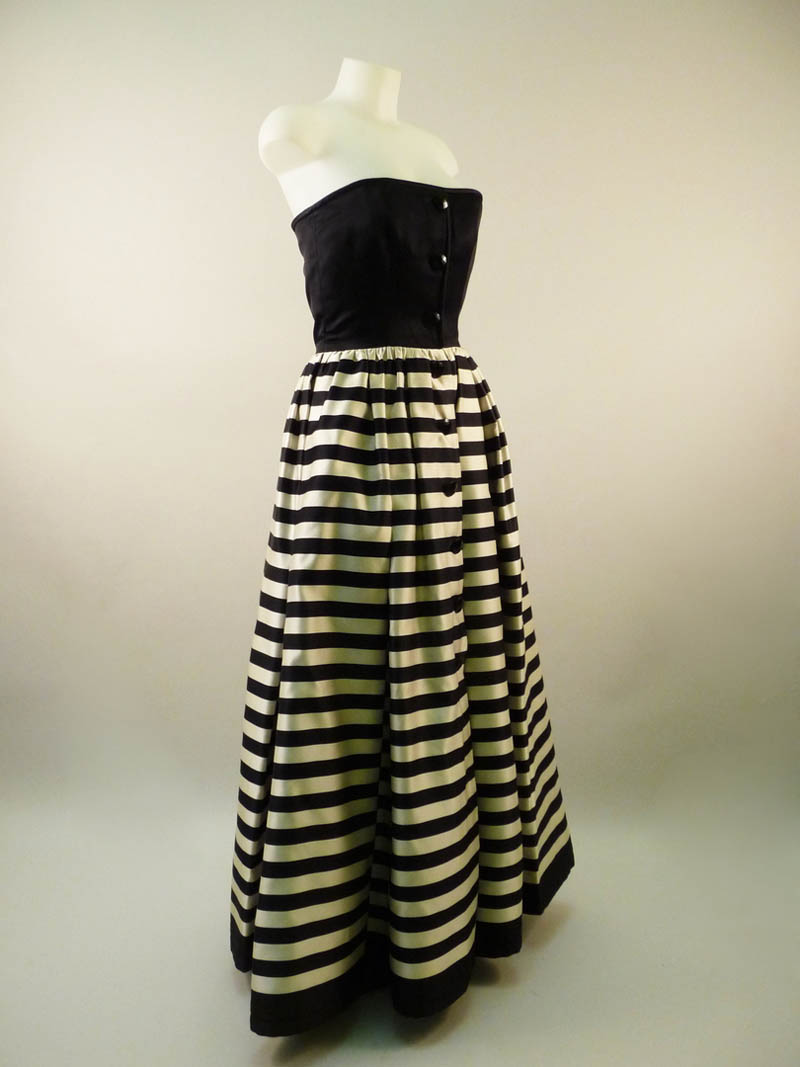 ABITO LUNGO DA SERA IN RASO - NIGHT SATIN DRESS VALENTINO BOUTIQUE Anni Ottanta corpetto aderente nero con bottoni gioiello, ampia gonna arricciata a linee orizzontali bianche e nere, tasche a taglio laterali, aperta sul davanti con bottoni gioiello, maniche non pertinenti, lievi difetti tg M circa