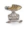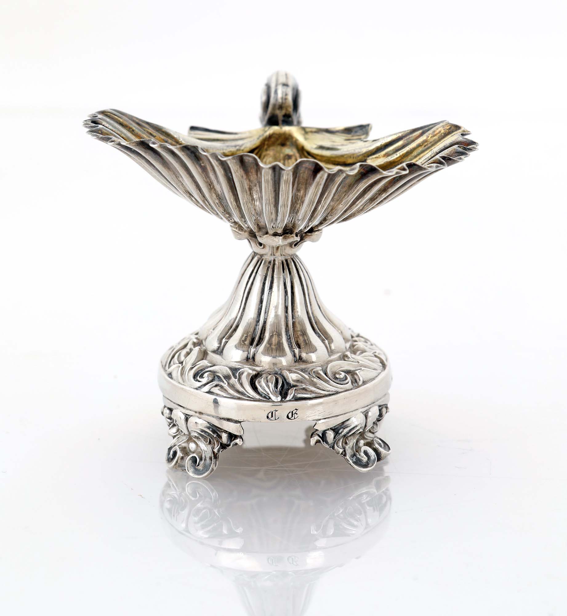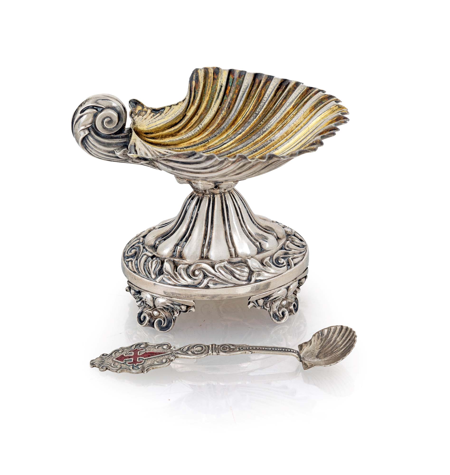 Saliera in argento 950/000 sbalzato con cucchiaino, Francia, 1820 ca. vaschetta a forma di conchiglia con impugnatura a ricciolo; base ovale baccellata circondata da volute vegetali, elemento decorativo ripreso a sostegno dell'oggetto. Il cucchiaino reca paletta a valva di conchiglia e impugnatura caratterizzata da croce di San Giacomo in smalto rosso cm 8x9,5x8,5 - cucchiaino cm 9 - peso complessivo gr. 76