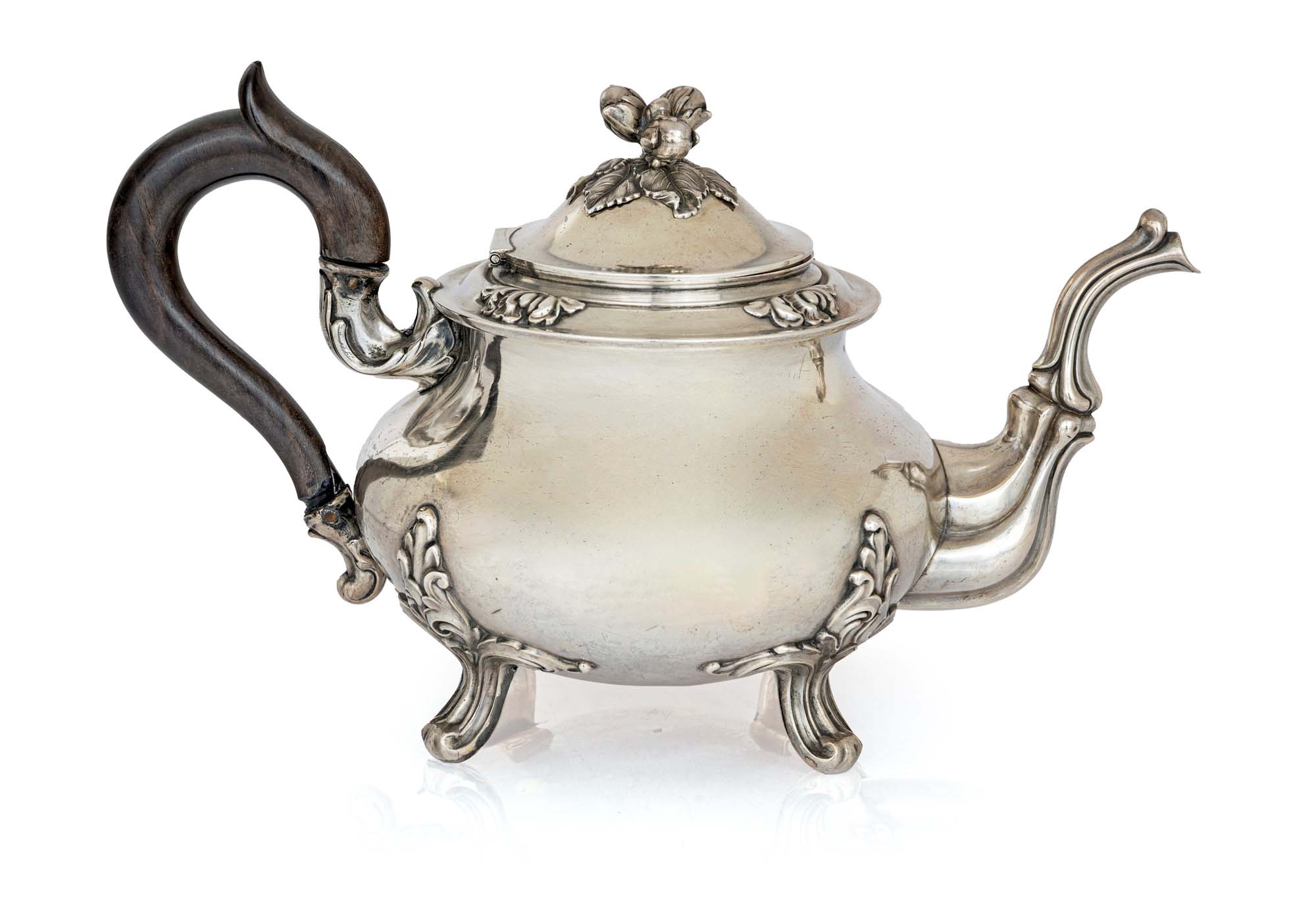 Teiera, Parigi 1839, argentiere Alphonse Debain corpo sferico con piedi raccordati da elementi vegetali; coperchio incernierato con presa scultorea in forma di trionfo di boccioli; versatoio sagomato, manico in legno cm 18x30x15 - peso lordo gr. 694