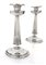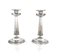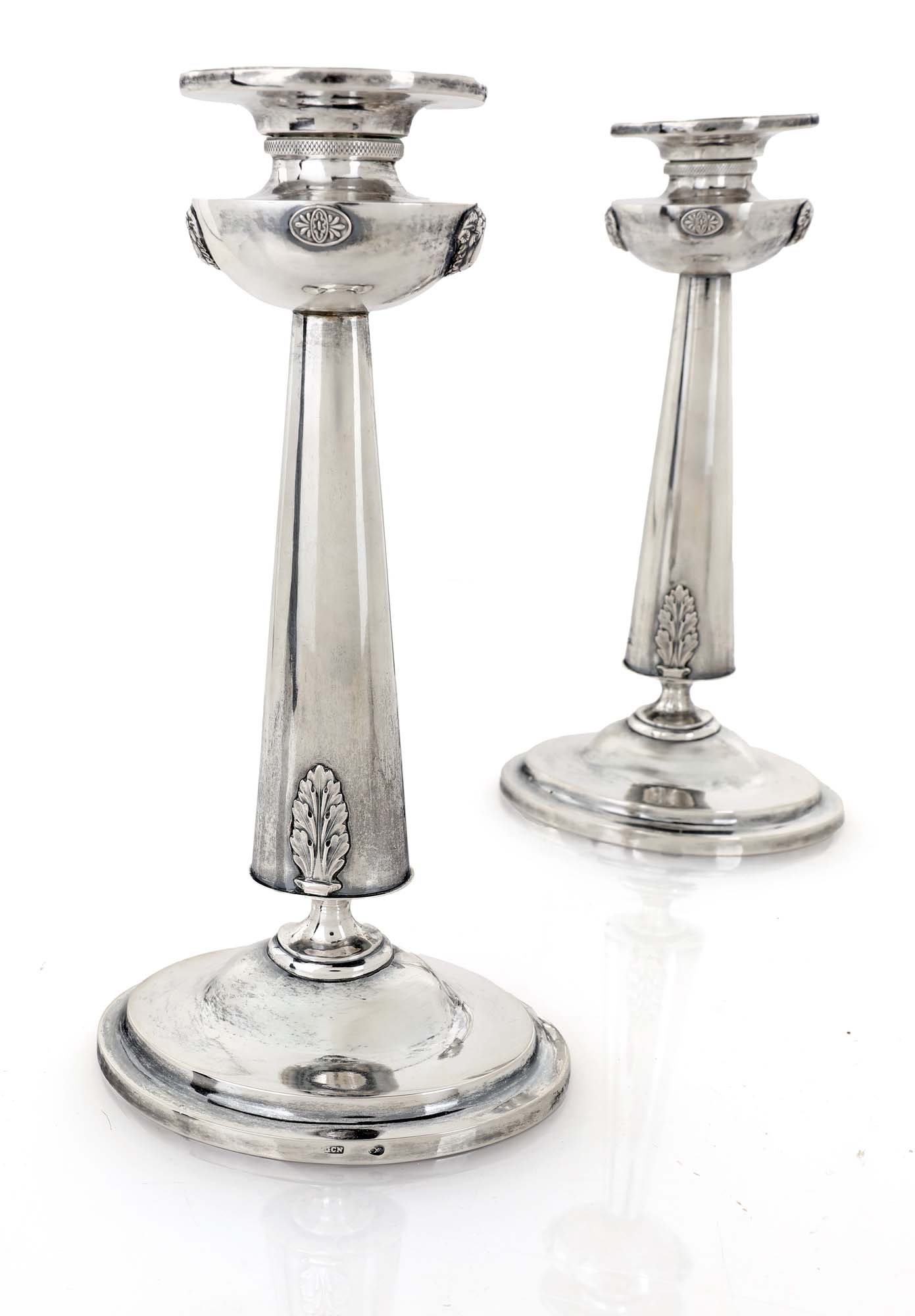 Coppia di candelieri, Germania, Augsburg, inizi XIX secolo caratterizzati da portacandela, stelo e piede a sezione ovale; superficie liscia caratterizzata da fregi cesellati in forma di palmette poste alla base dello stelo, corolle e teste d'ariete diametralmente opposte sul portacandela altezza cm 25,5 - peso complessivo gr. 667