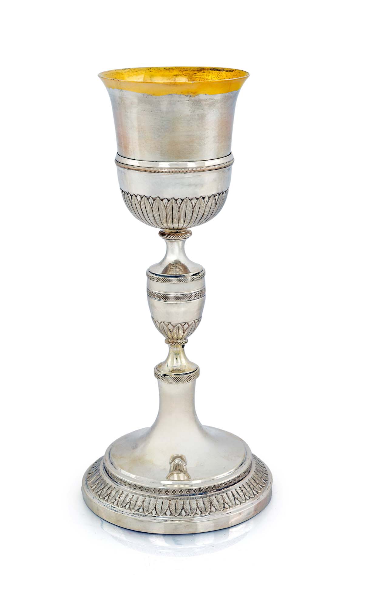 Calice in argento con profili a palmette coppa con interno dorato con parte...