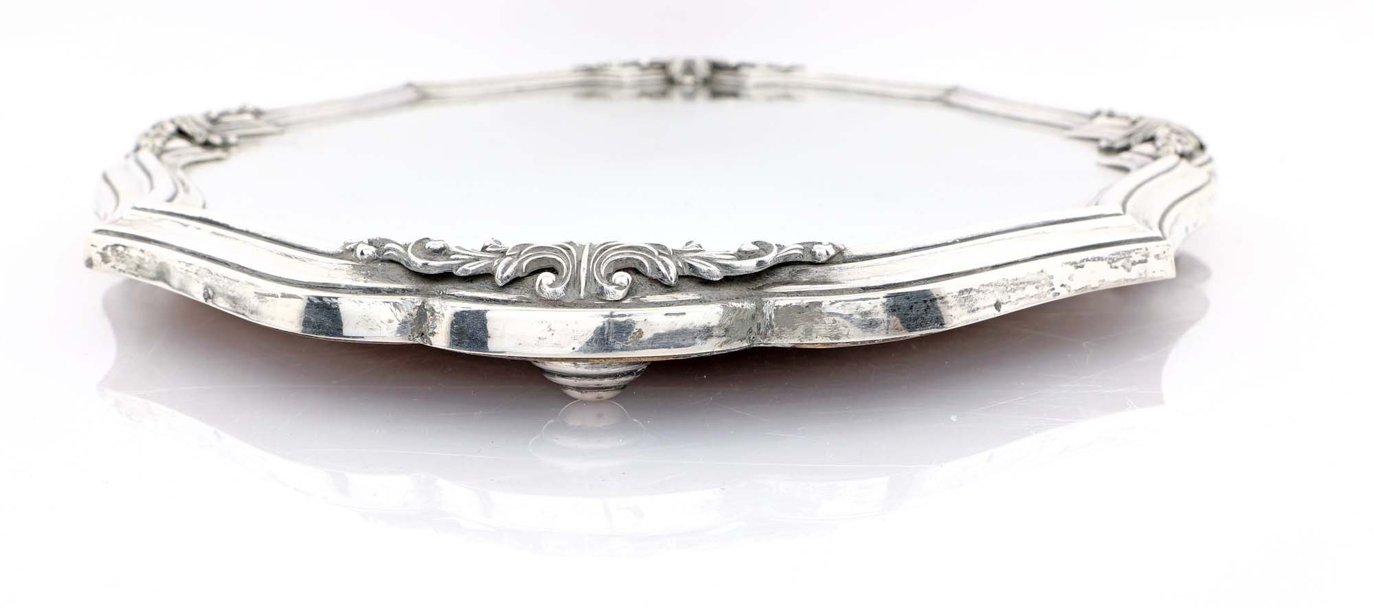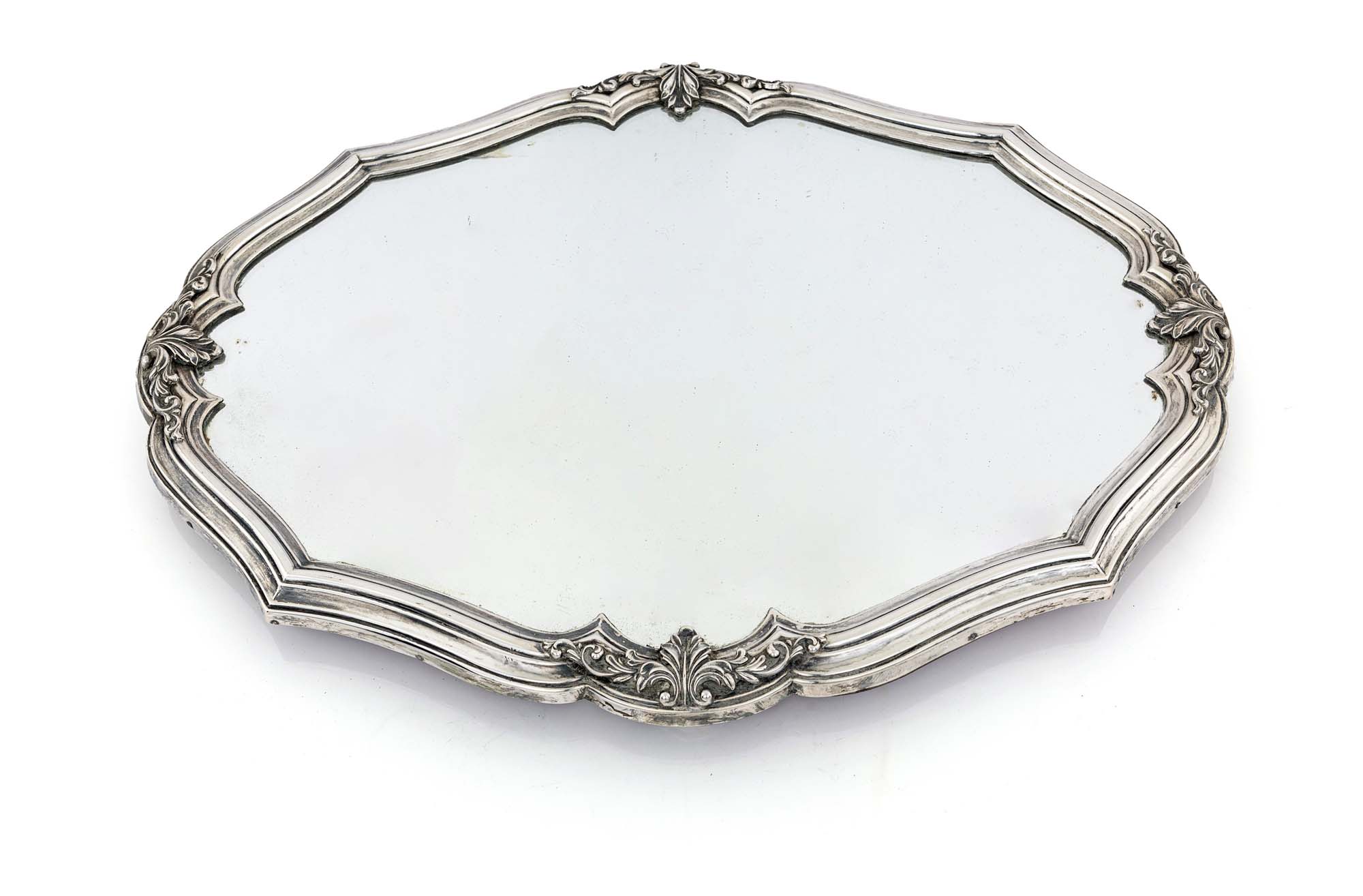 Surtout sagomato in argento e specchio cornice mistilinea modanata impreziosita da composizioni vegetali sbalzate; supporto in legno sorretto da piedi a cupolino cm 47x36