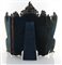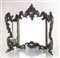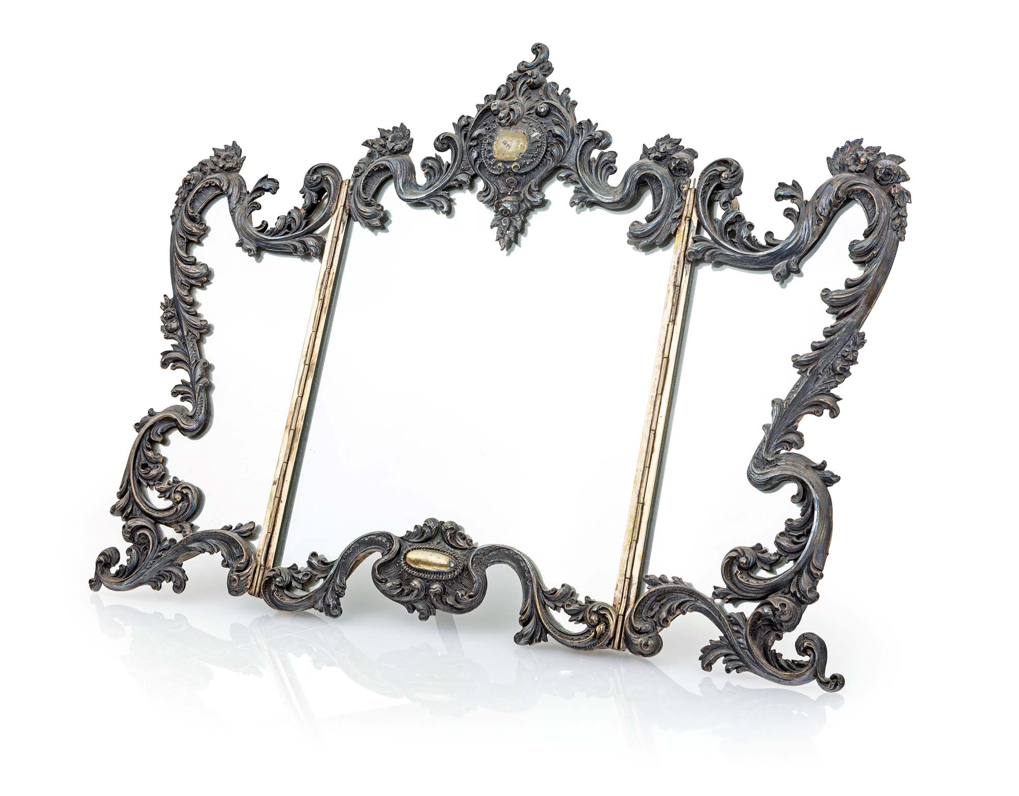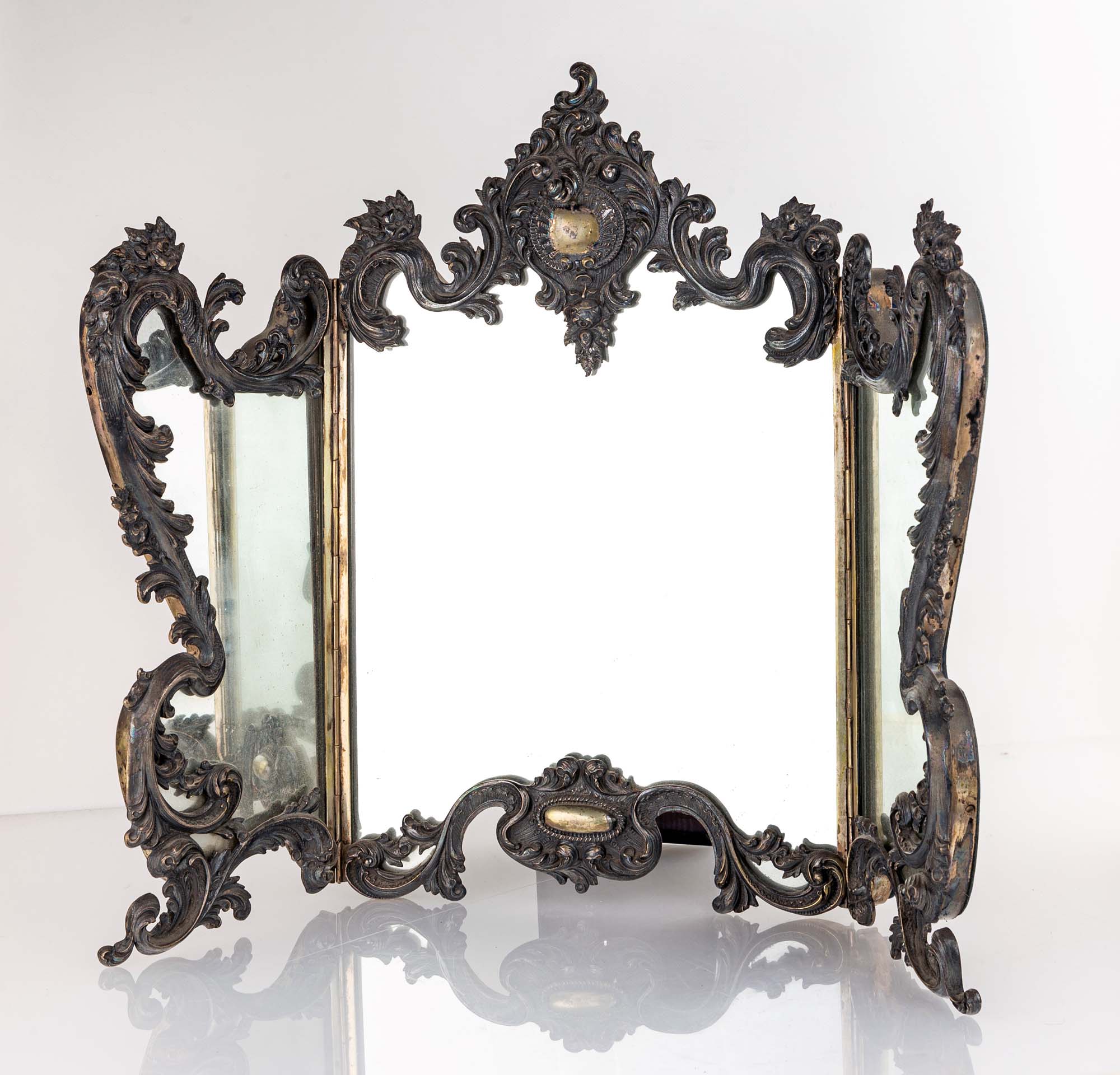 Grande cartagloria a trittico in argento con cornice sagomata costituita da volute vegetali variamente mosse disposte in sequenza simmetrica lungo l'intero perimetro; la tabella centrale è dominata da un cartiglio cui corrisponde analogo elemento nella parte inferiore; ante laterali incernierate. Trasformata in specchiera cm 50x65
