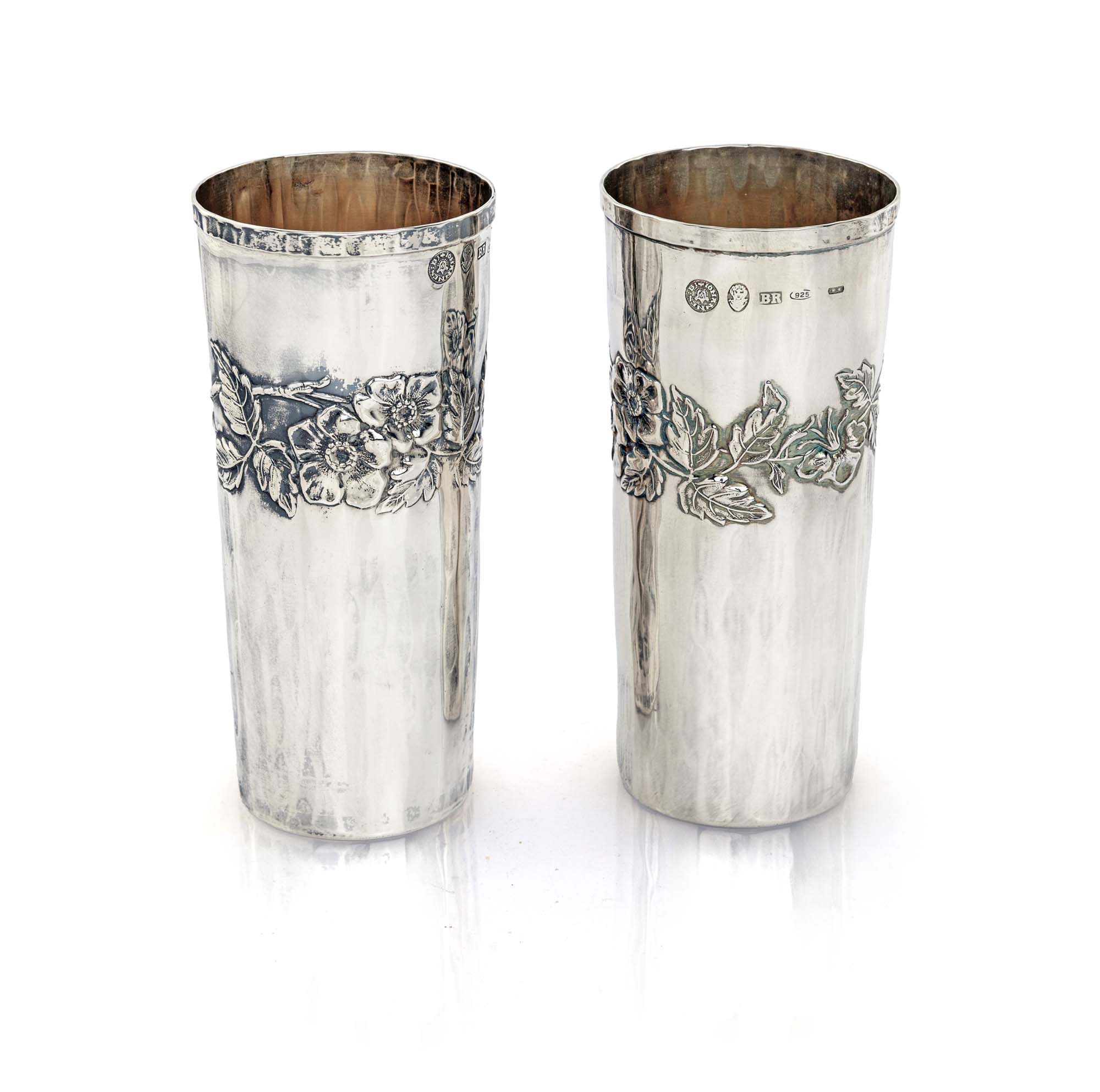 Coppia di bicchieri in argento 925/000, Brandimarte, Firenze di forma cilindrica decorati ognuno da un ramo fiorito realizzato a sbalzo. Entro scatola con garanzia cm 12,7x5,7 - peso complessivo gr. 195