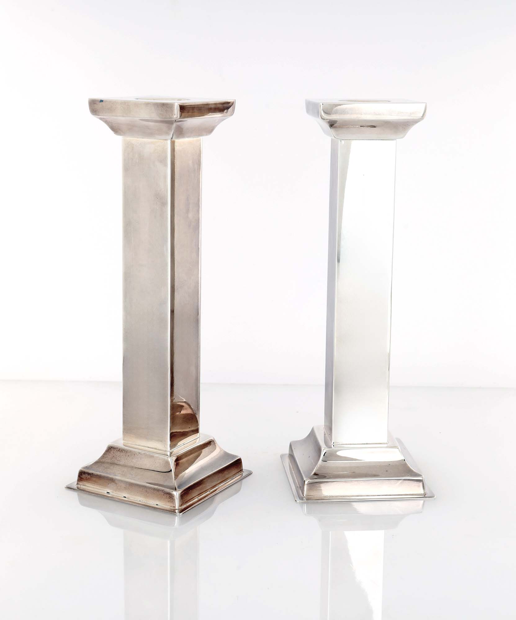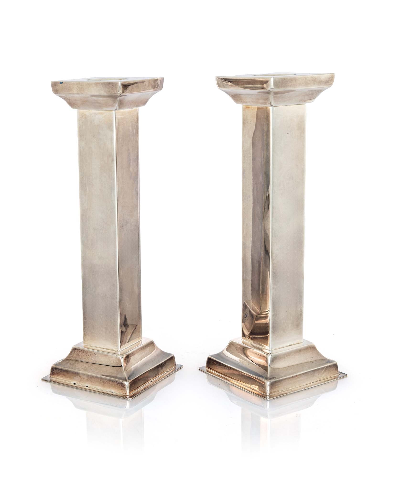 Coppia di candelieri in argento massiccio 925/000 stelo a colonna squadrata su base quadrangolare gradinata altezza cm 24,5 - peso complessivo gr. 878