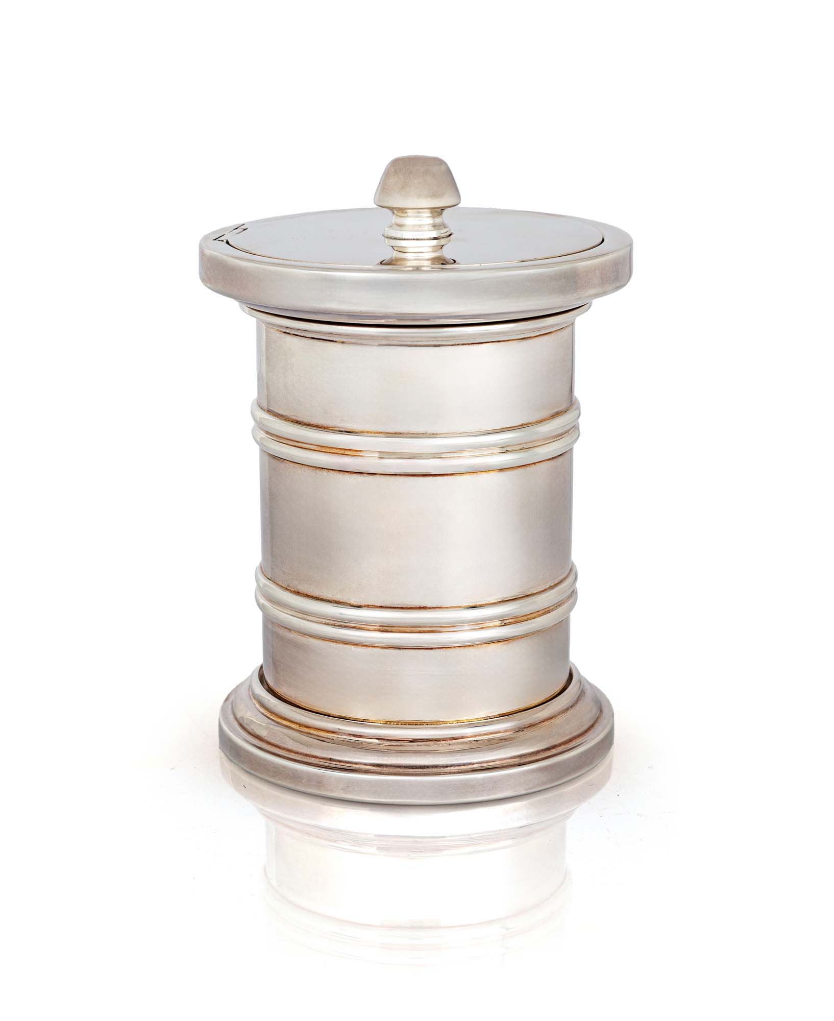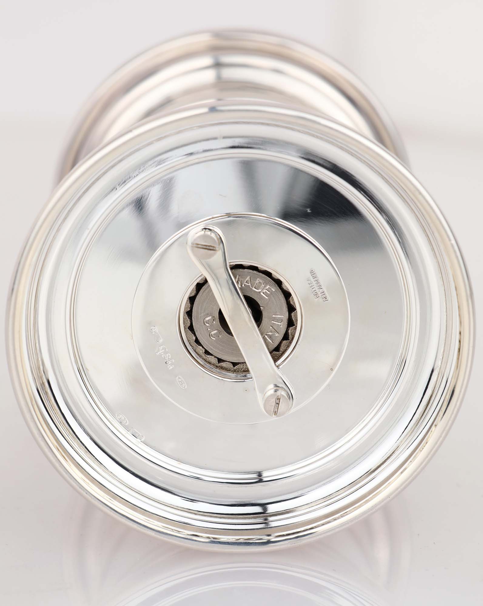Grande macinapepe in argento 925/000, Giuseppe Silva Milano, per Bottega dell'Argento corpo a rocchetto di forma cilindrica caratterizzato da due ordini di nervature; piede modanato, copertura superiore incernierata a scomparsa con presa a fungo cm 13x9,5 - peso complessivo lordo gr. 746