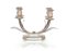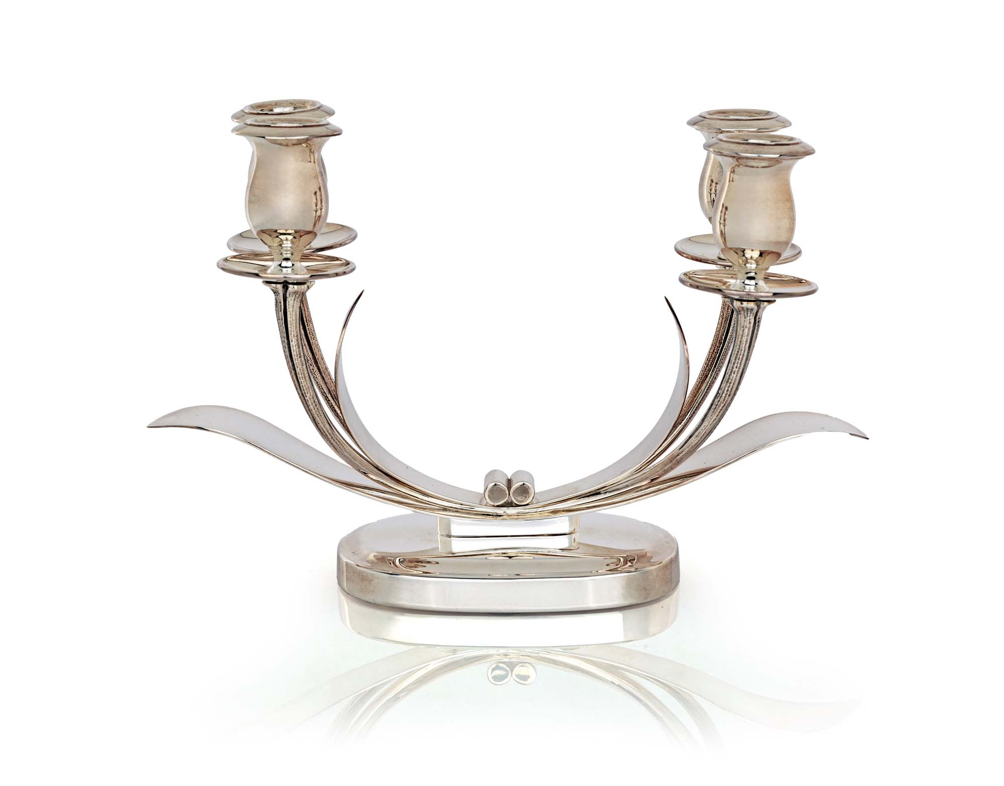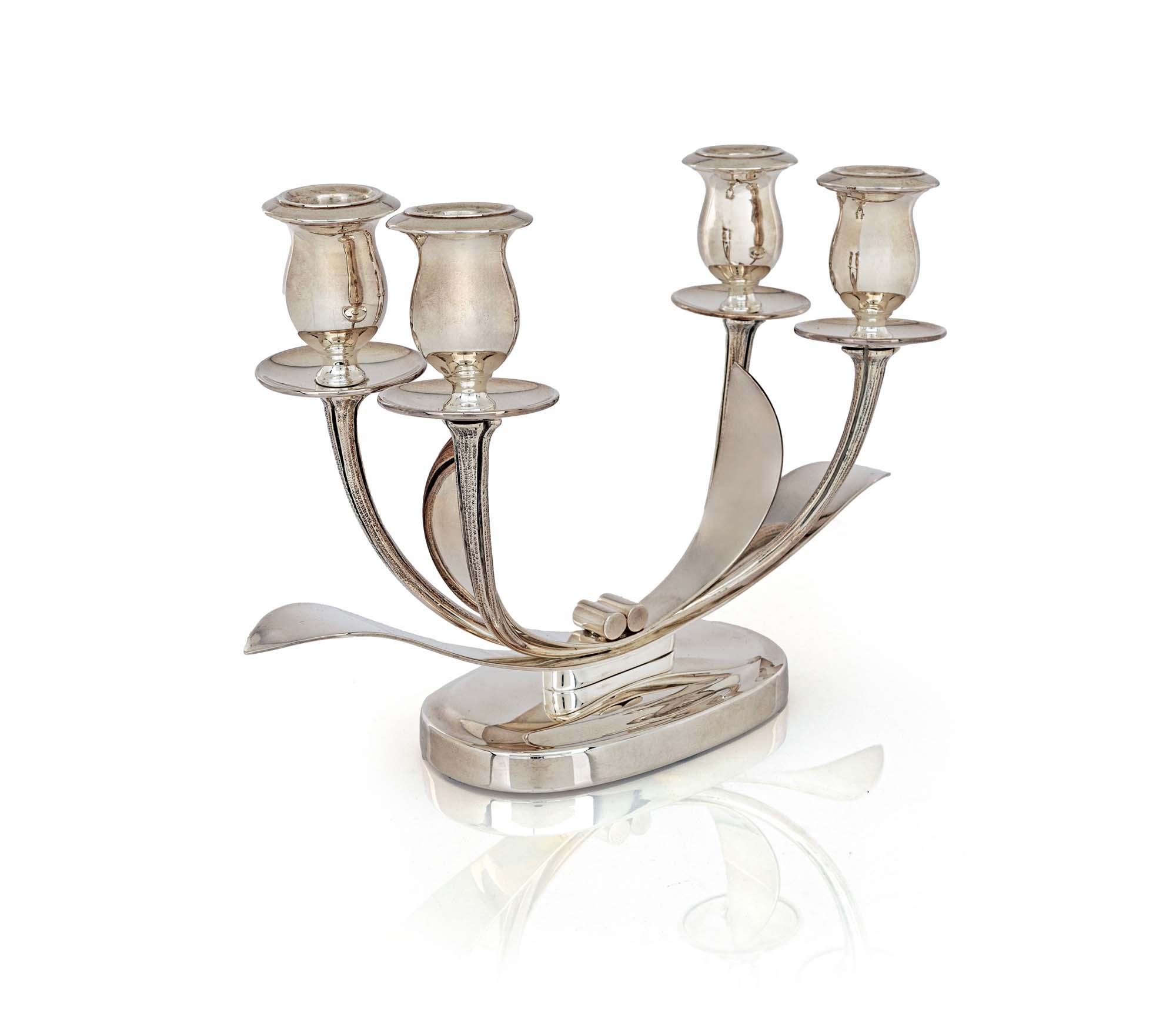 Candelabro a quattro luci in argento massiccio 925/000, Giuseppe Silva, Milano bracci arcuati paralleli arricchiti da lunghe foglie lanceolate incurvate, piede ovale cm 19x28x8,3 - peso lordo gr. 914
