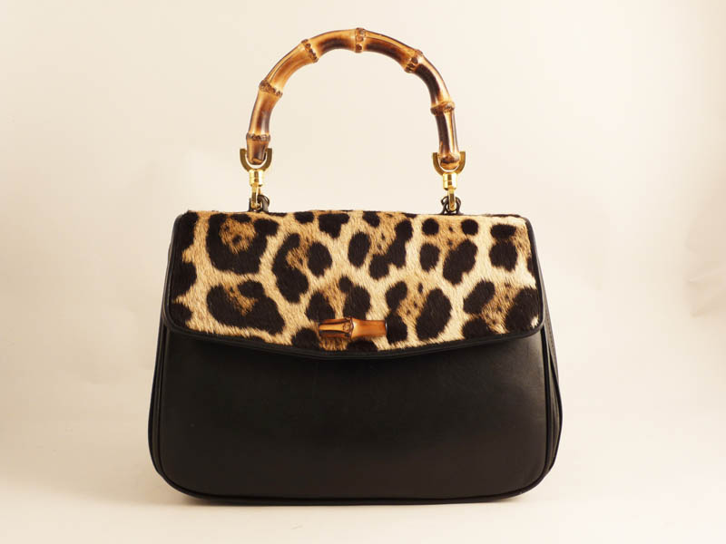 BORSETTA MODELLO BAMBOO IN LEOPARDO E PELLE NERA - BAMBOO HANDBAG MODEL IN LEOPARD AND BLACK LEATHER Pelagotti Roberto Firenze manici e chiusura in bamboo e piccolo borsellino in pelliccia coordinato (come lotto precedente)