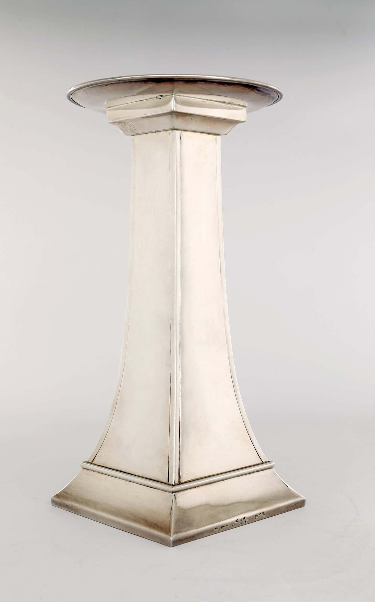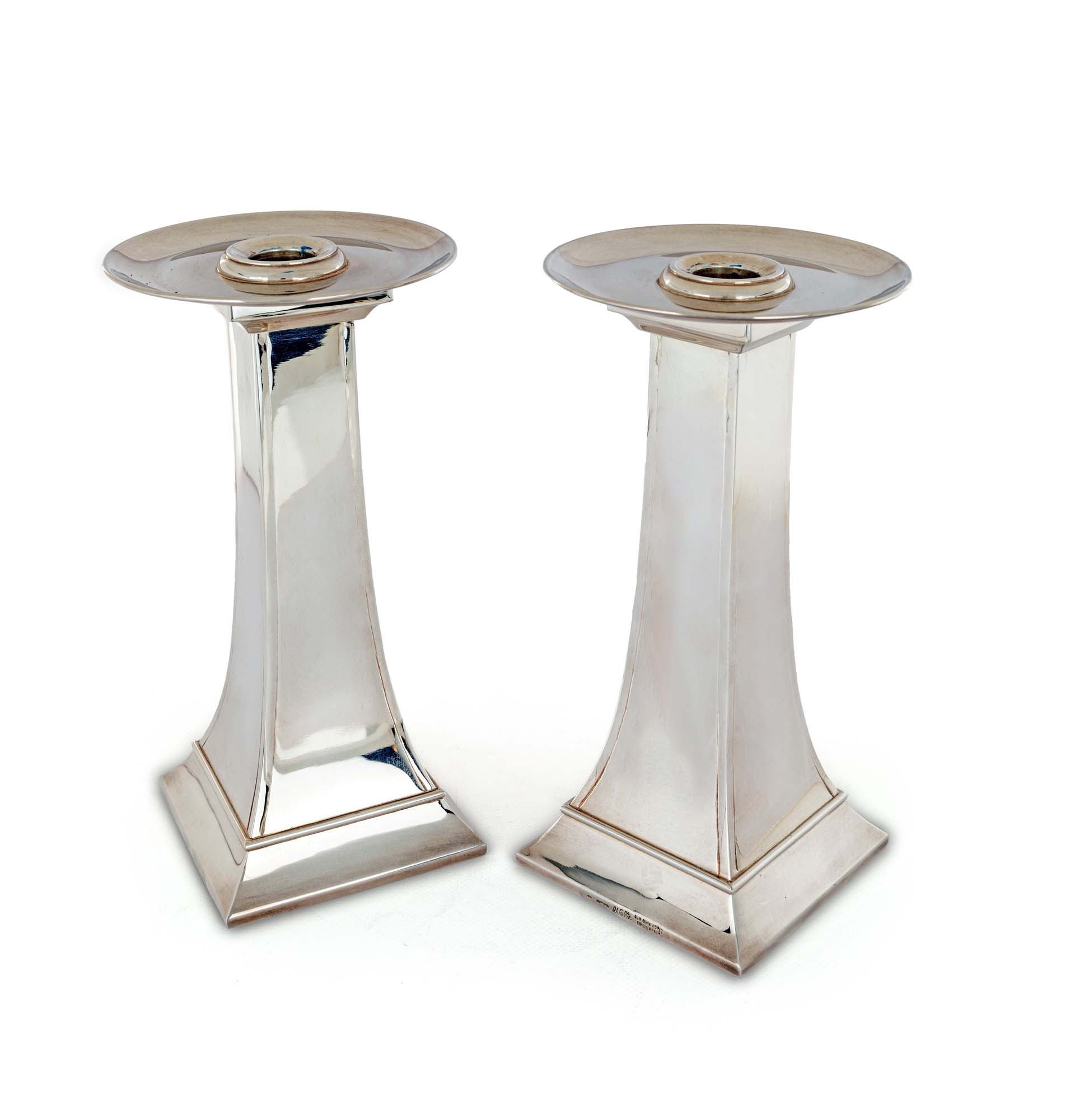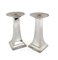 Coppia di candelieri squadrati, Argentiere Vallè, Milano, per Bottega dell'Argento a forma di obelisco con sommità tronca rifinita da un ampio piattello reggicera di forma circolare altezza cm 23 - peso complessivo gr. 1100