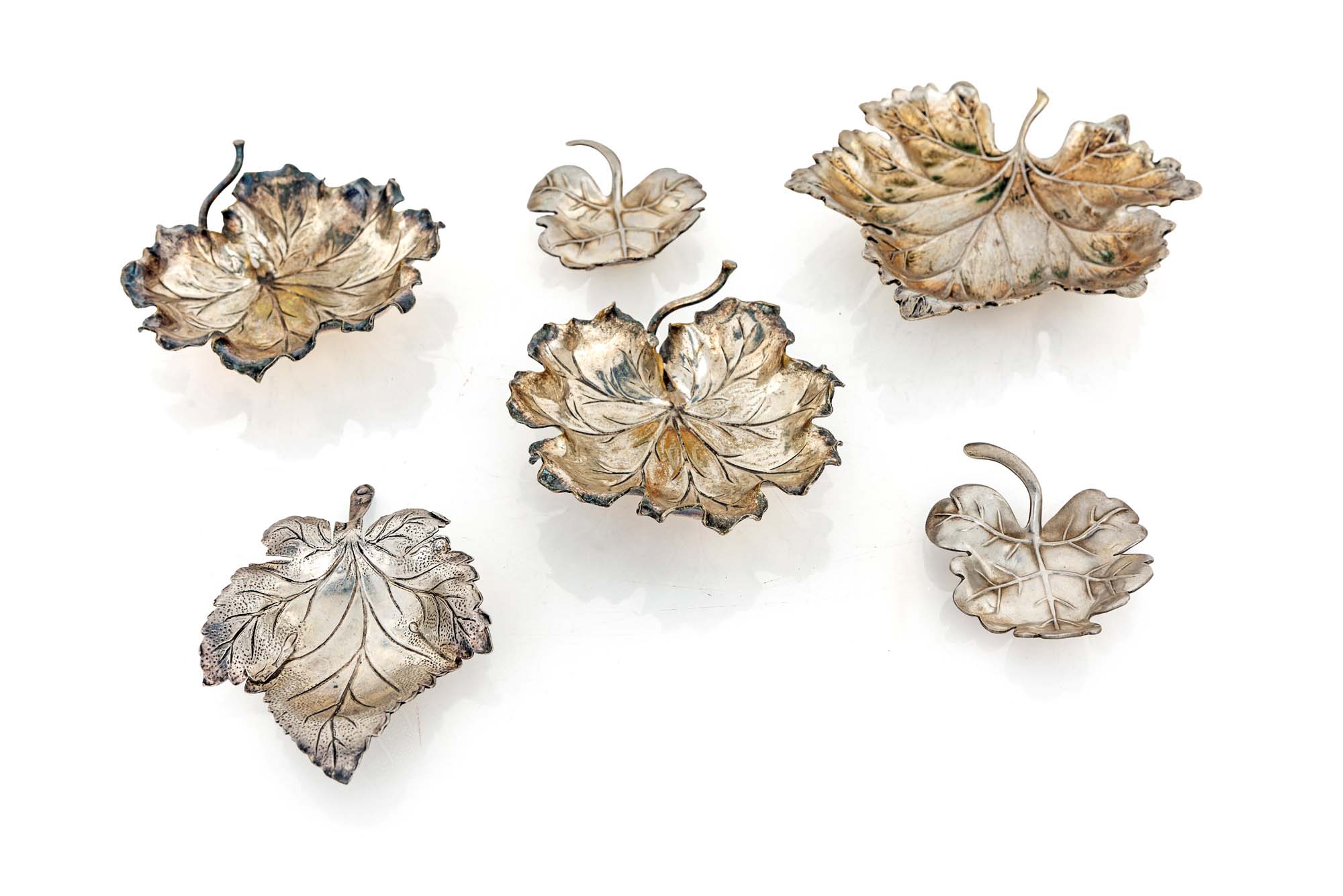 Sei foglie diverse in argento una coppia Brandimarte (cm 8,5x6); una coppia Massoni (cm 8,5x8), una coppia con etichetta "Bottega dell'Argento" (cm 6x5); la più grande con tracce di doratura lungo la superficie interna (cm 11x9,5) misure diverse - peso complessivo gr. 246