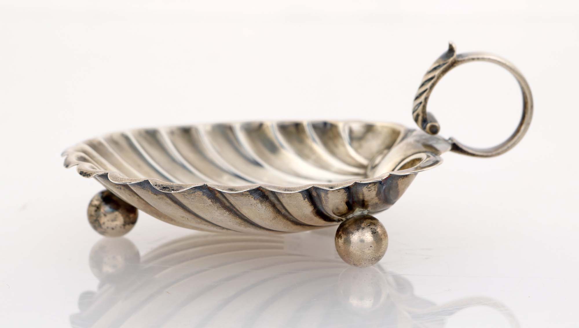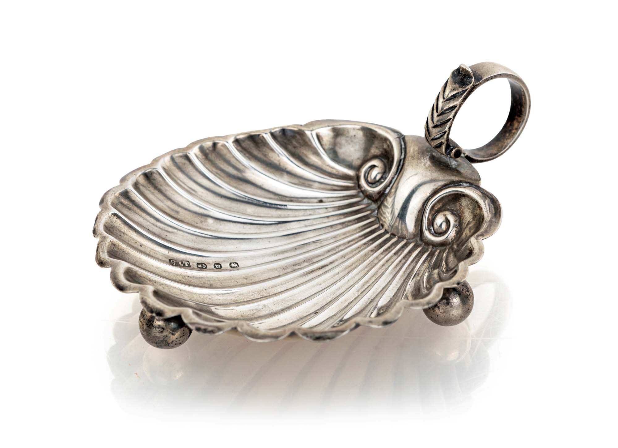 Vaschetta a forma di conchiglia con manico, Birmingham, 1896, argentiere B&T poggiante su tre piedi a sfera cm 5,5x13x10,5 - gr. 90