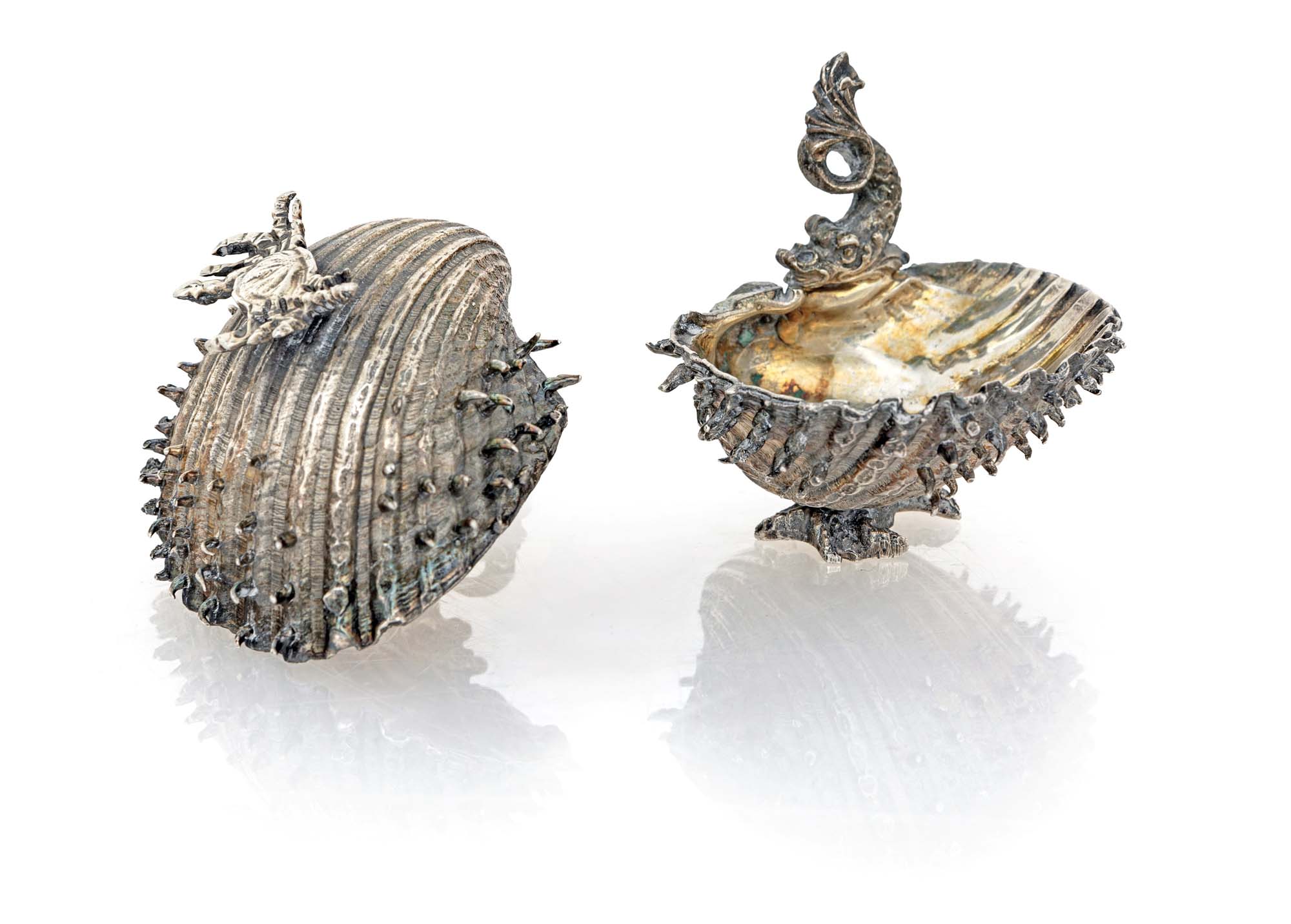 Coppia di vaschette a forma di conchiglia con impugnatura scultorea a guisa...