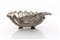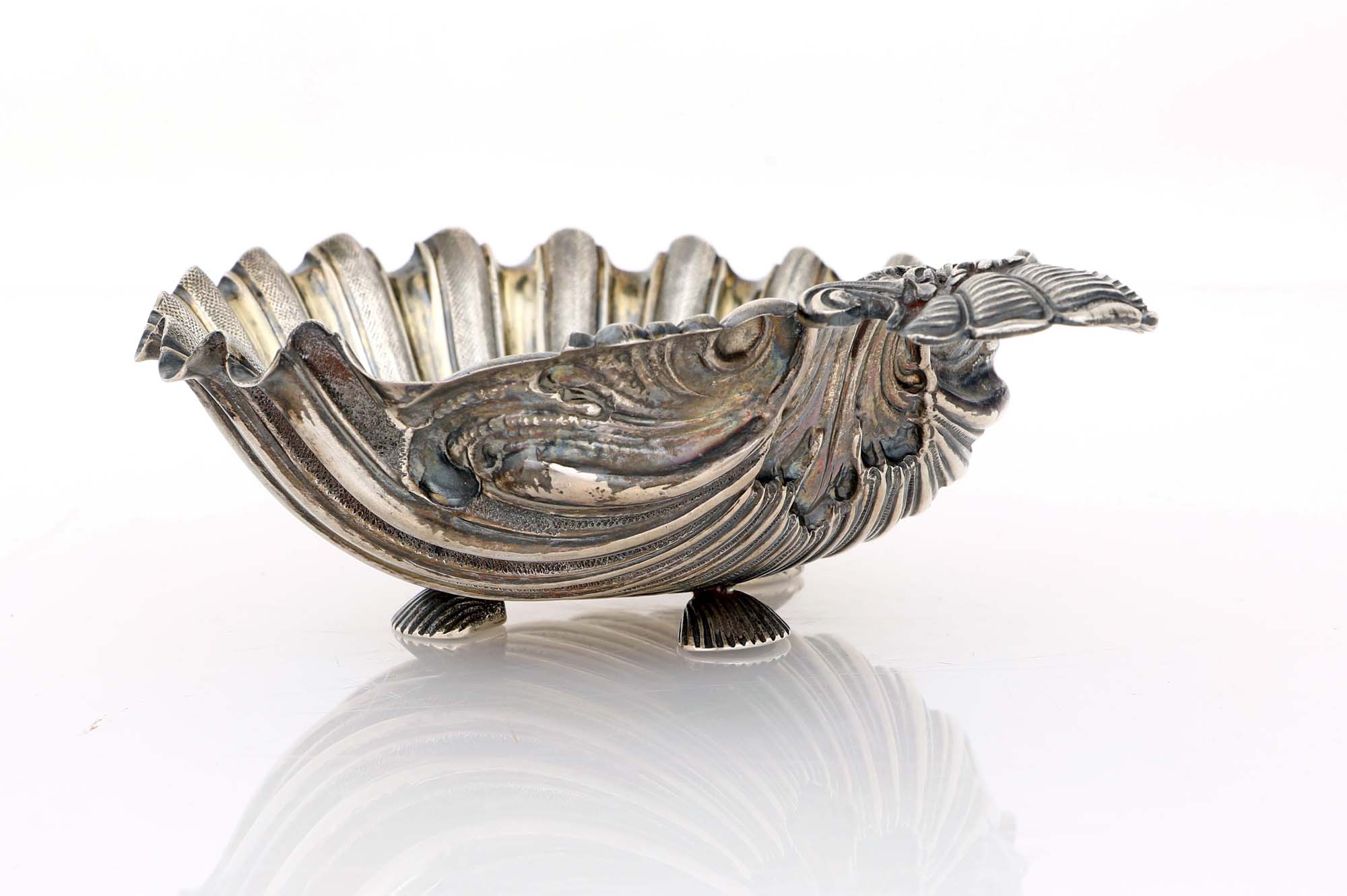 Coppetta in argento sterling a forma di conchiglia impugnatura a forma di valva collegata da volute vegetali; tre piedini a conchiglia cm 5,5x15x16 - gr. 216
