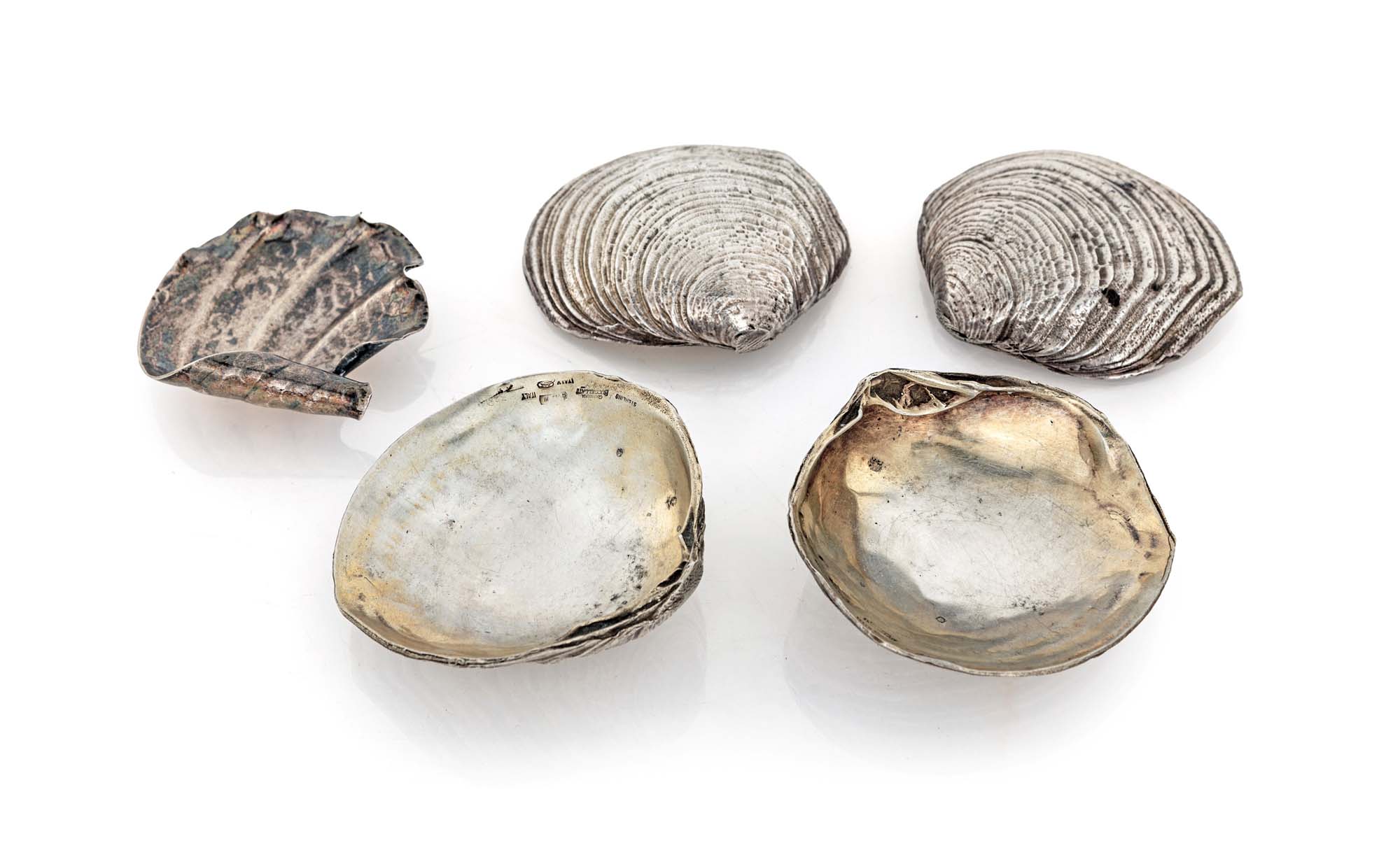 Cinque posacenere in argento 925/000, rispettivamente GianMaria e Federico Buccellati quattro conchiglie ed una foglia stilizzata con dedica incisa cm 2x7x7 (le quattro) e cm 6x5,5 - peso complessivo gr. 252