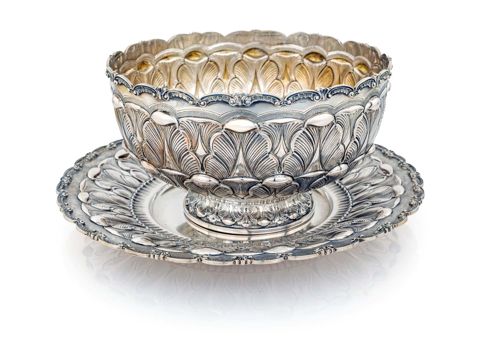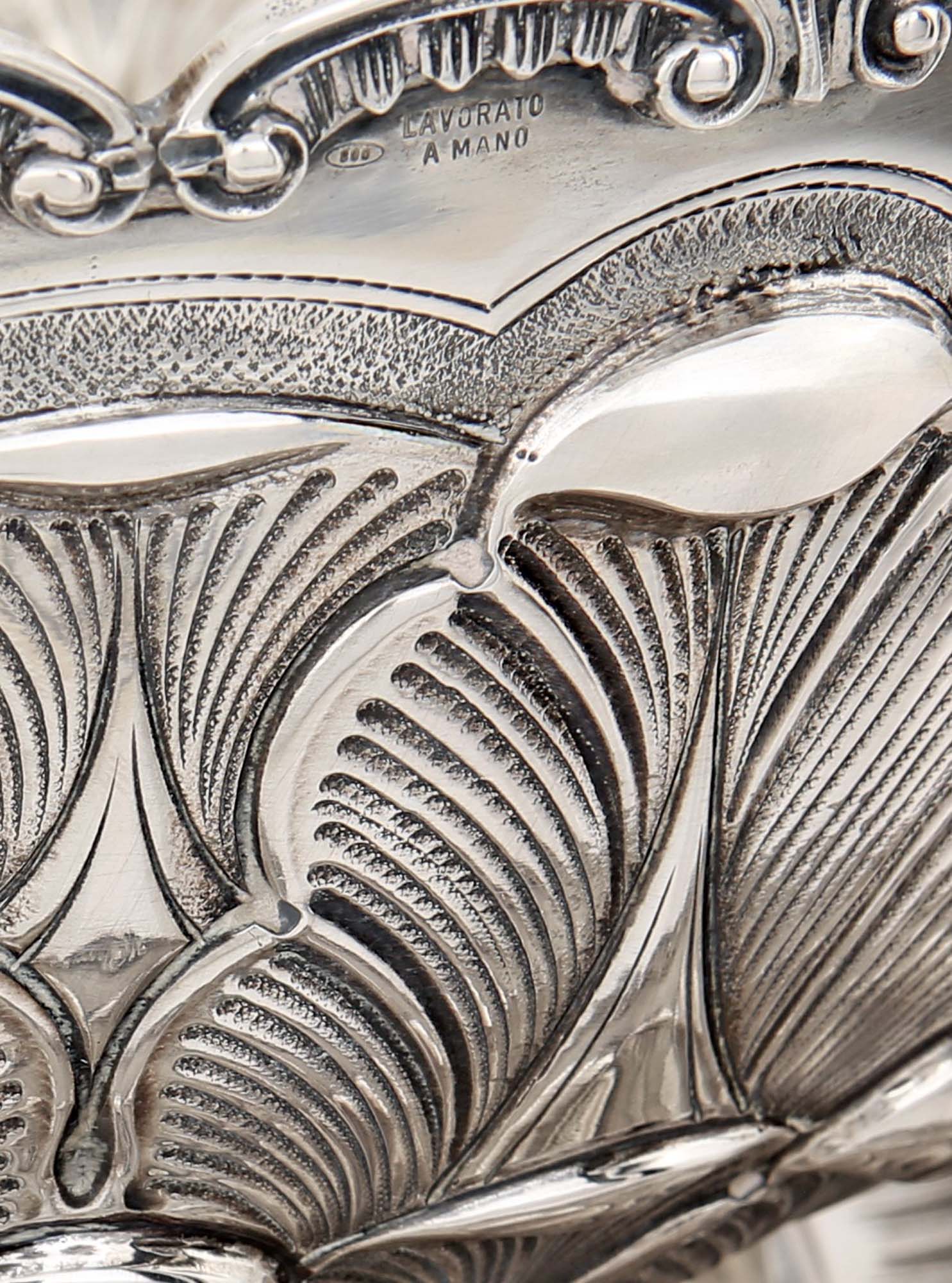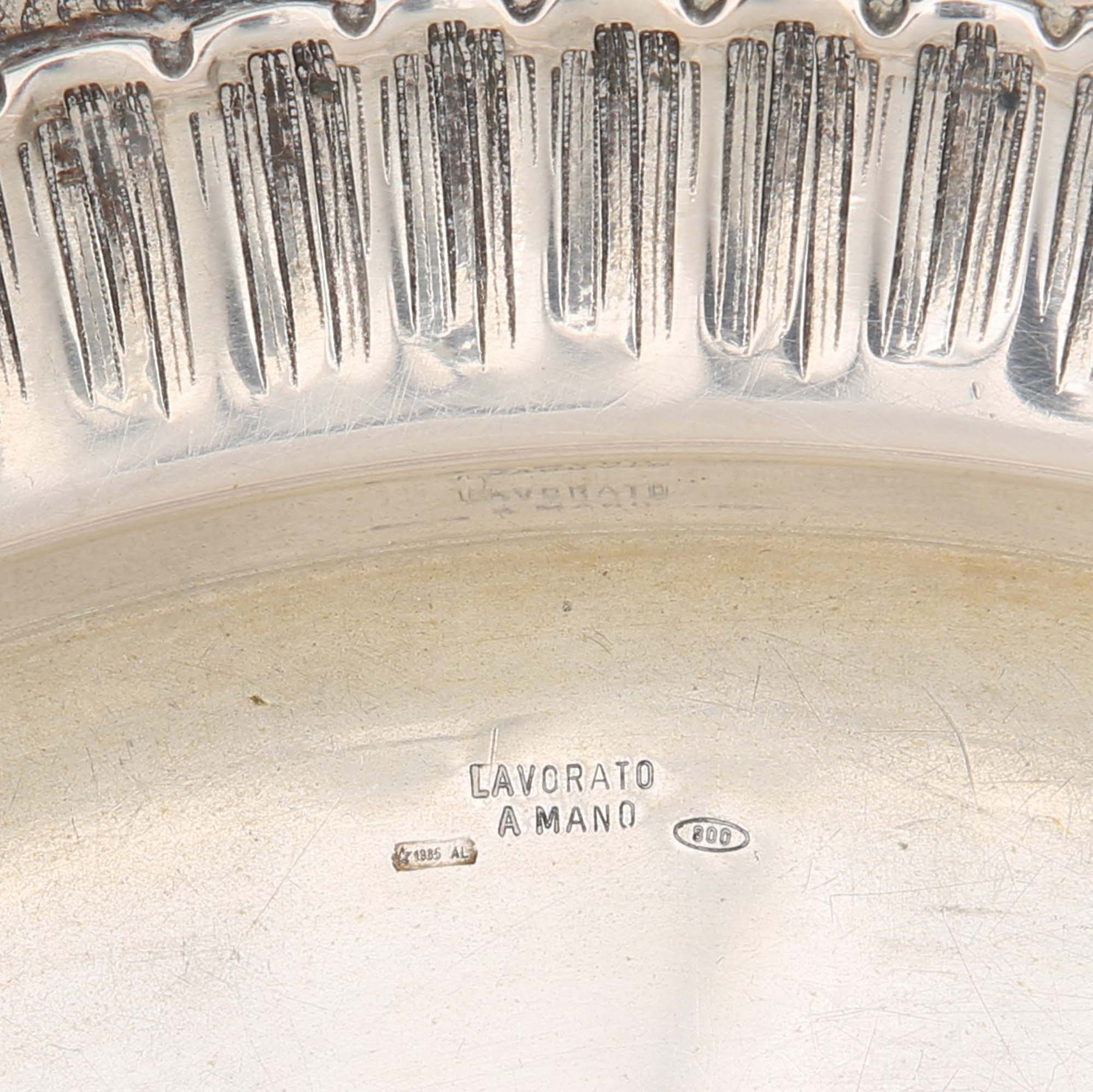Grande coppa centrotavola con piatto, argento 800/000 lavorato a mano decorati da grandi palmette sbalzate ed incise; orli centinati definiti da volute terminanti a ricciolo sottolineate da lambrecchini cesellati coppa cm 15,5x27 - gr. 1102 - piatto diametro cm 36,5 - gr. 1004 - peso complessivo gr. 2106