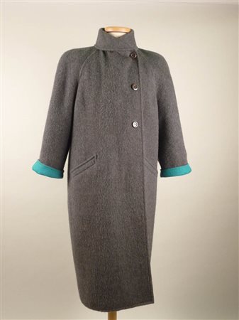 CAPPOTTO IN PANNO GRIGIO E TURCHESE - GRAY AND TURQUOISE FABRIC COAT Valentino Boutique maniche a raglain, tasche a taglio, abbottonatura laterale tg 10