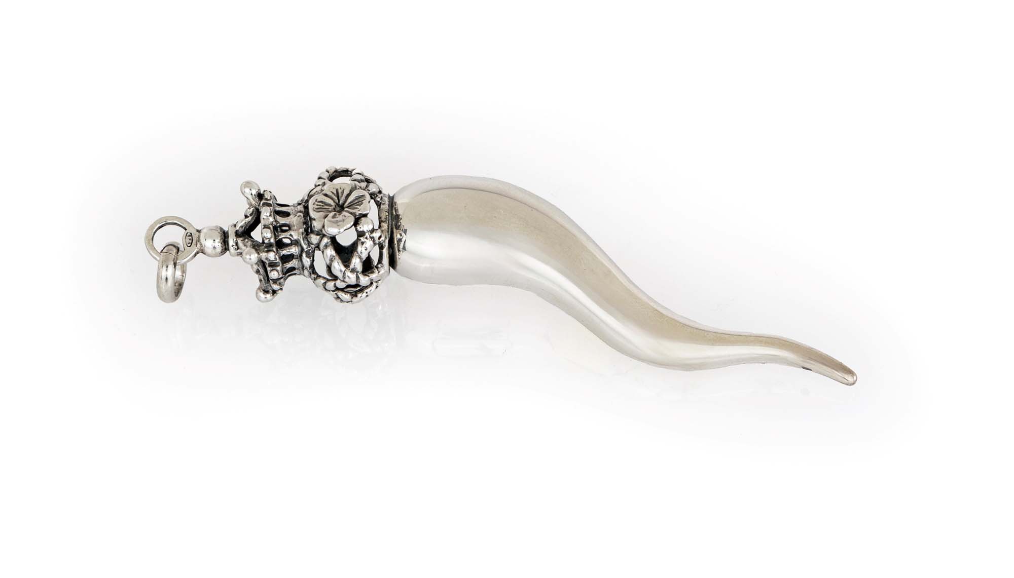 Corno portafortuna ad uso pendente dalla caratteristica forma incurvata,...