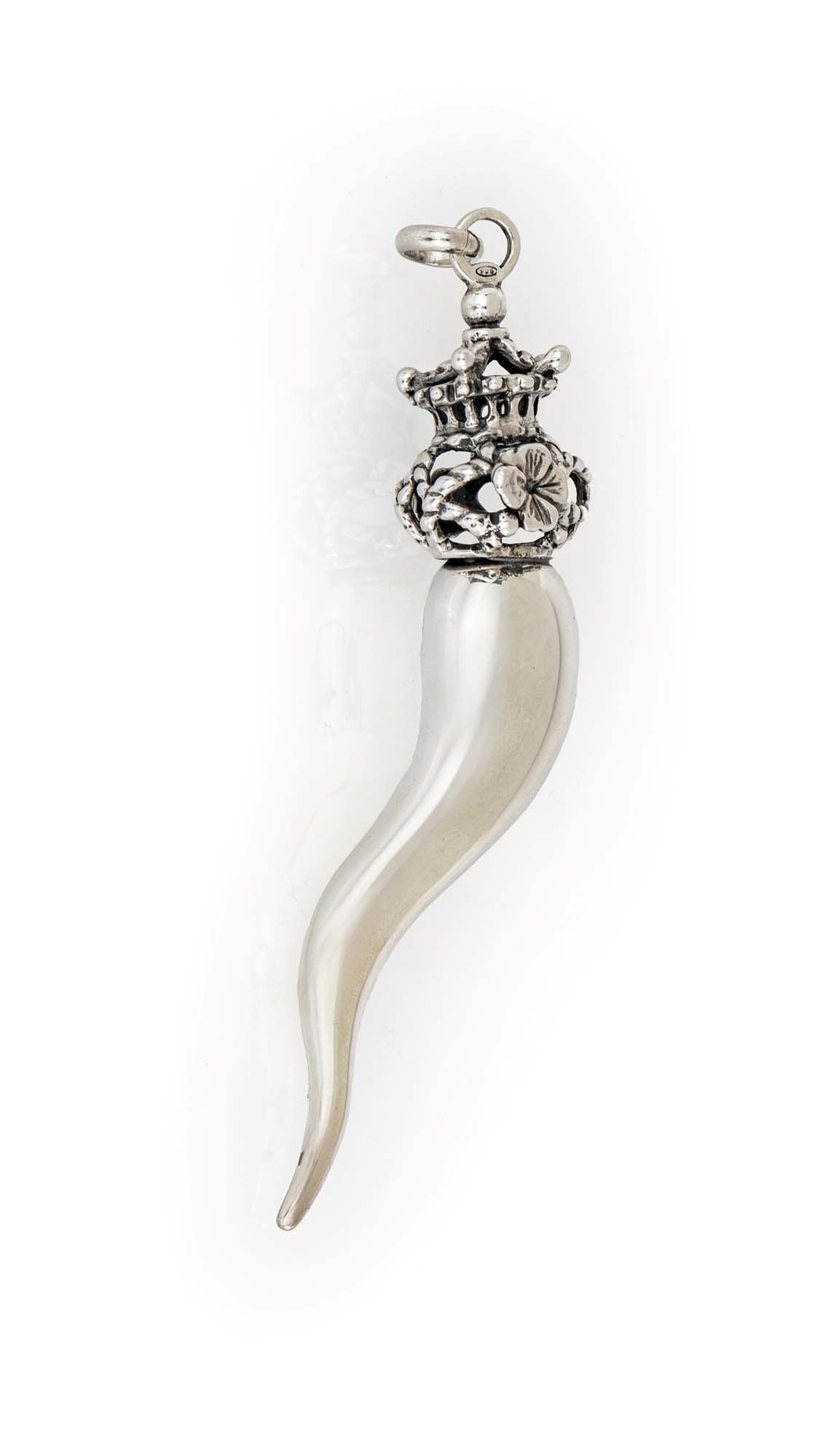 Corno portafortuna ad uso pendente dalla caratteristica forma incurvata, sormontato da una corona traforata impreziosita da piccole corolle; munito di anello cm 11 (anello incluso) - gr. 24
