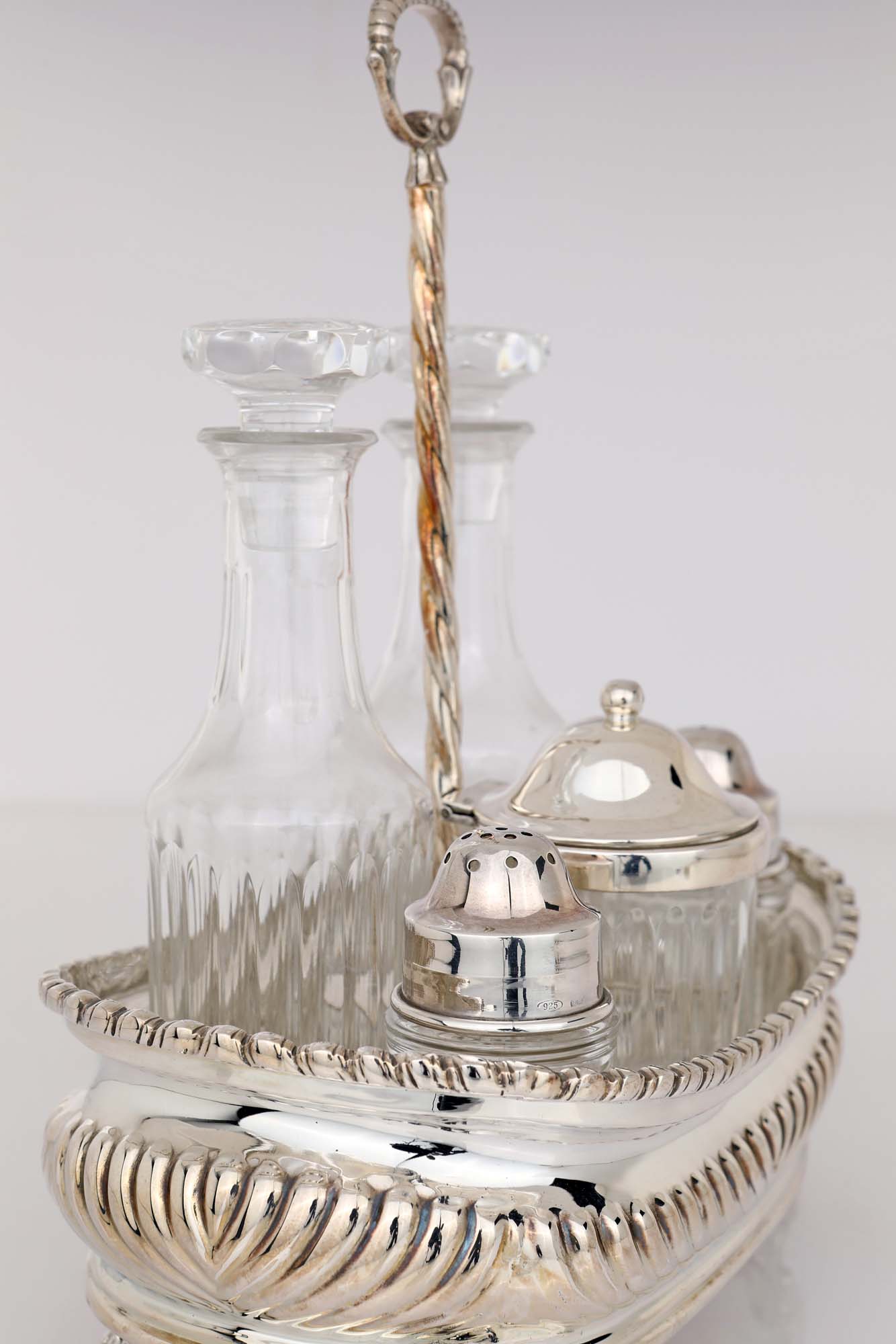 Cruet in argento 925/000, Messulam Milano, per Bottega dell'Argento corpo ovale con presa centrale astile sormontata da anello; completa di bottiglie per olio e aceto, sale e pepe, mostardiera cm 25,5x19x13,5 - gr. 594