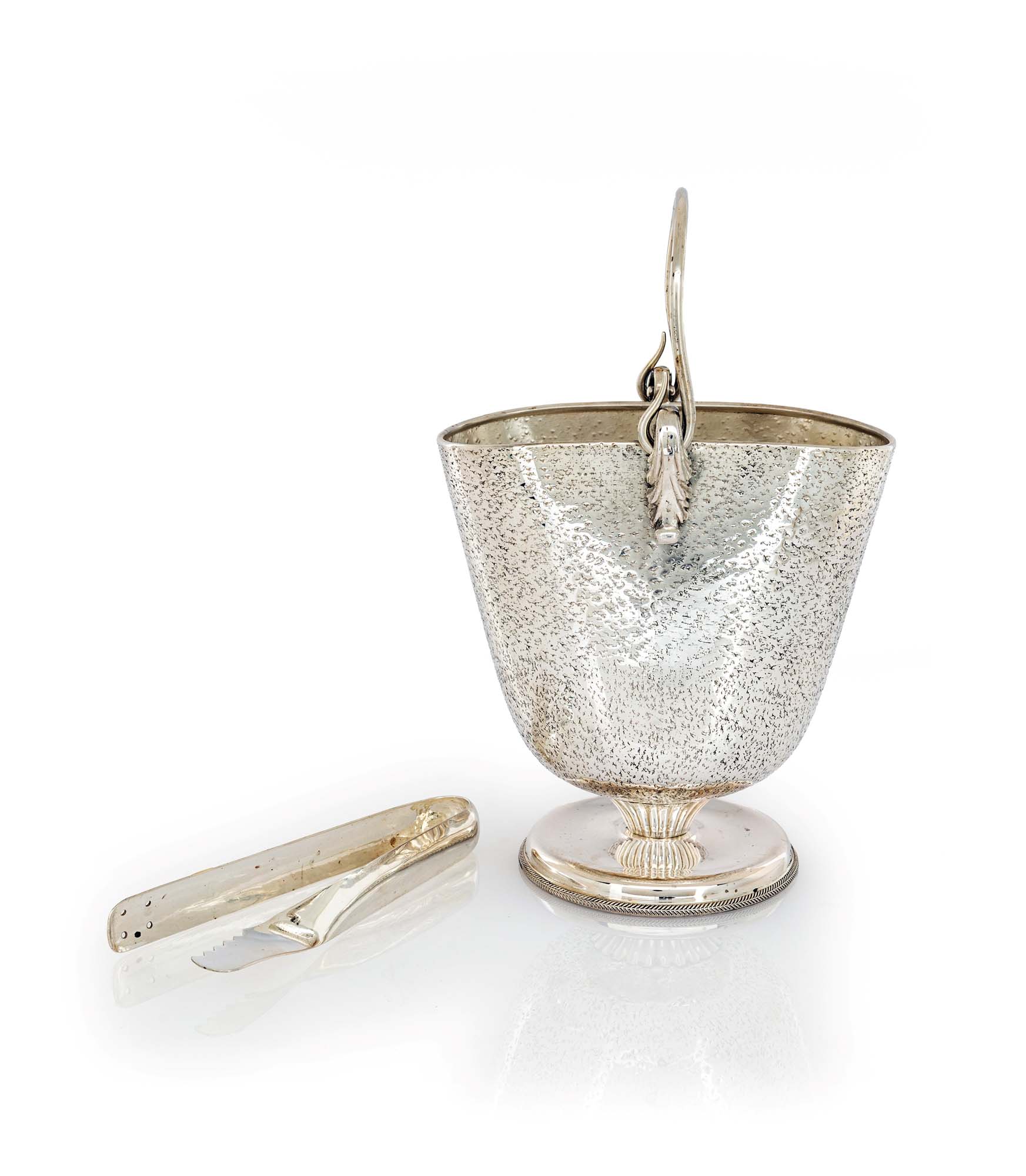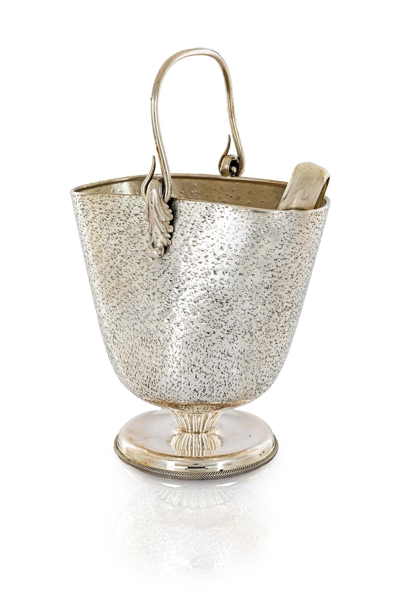 Secchiello portaghiaccio con pinza vaso di forma ovale schiacciata con superficie butterata, manico ad anello sorretto da rilievi vegetali, piede circolare liscio con orlo percorso da un motivo a spiga cm 25x16x12 e cm 15,5 - gr. 654