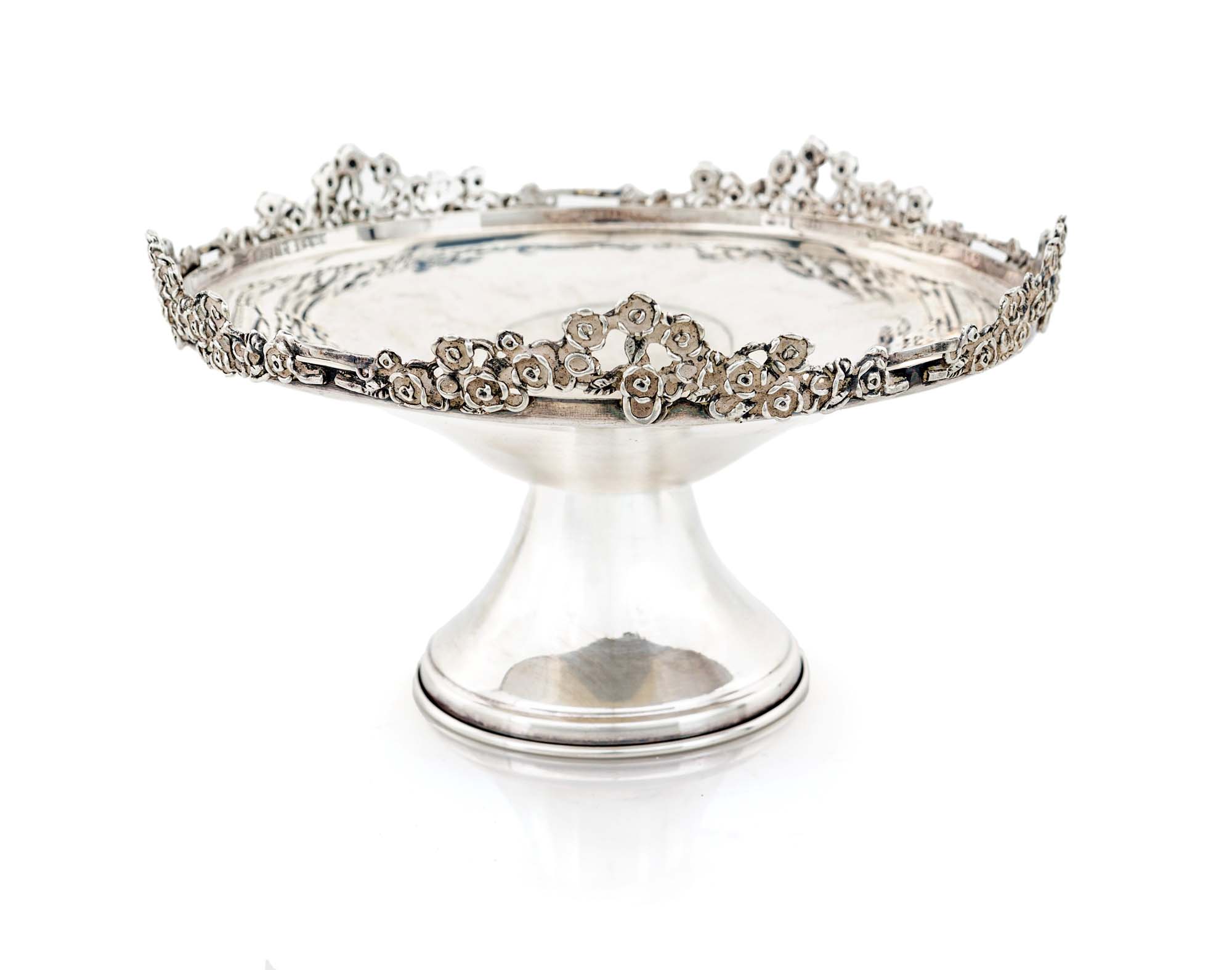 Alzatina in argento 800/000 lavorato a mano con orlo racchiuso da composizioni floreali fusi ed applicati; piede a tronco di cono cm 9x15,5 - gr. 120