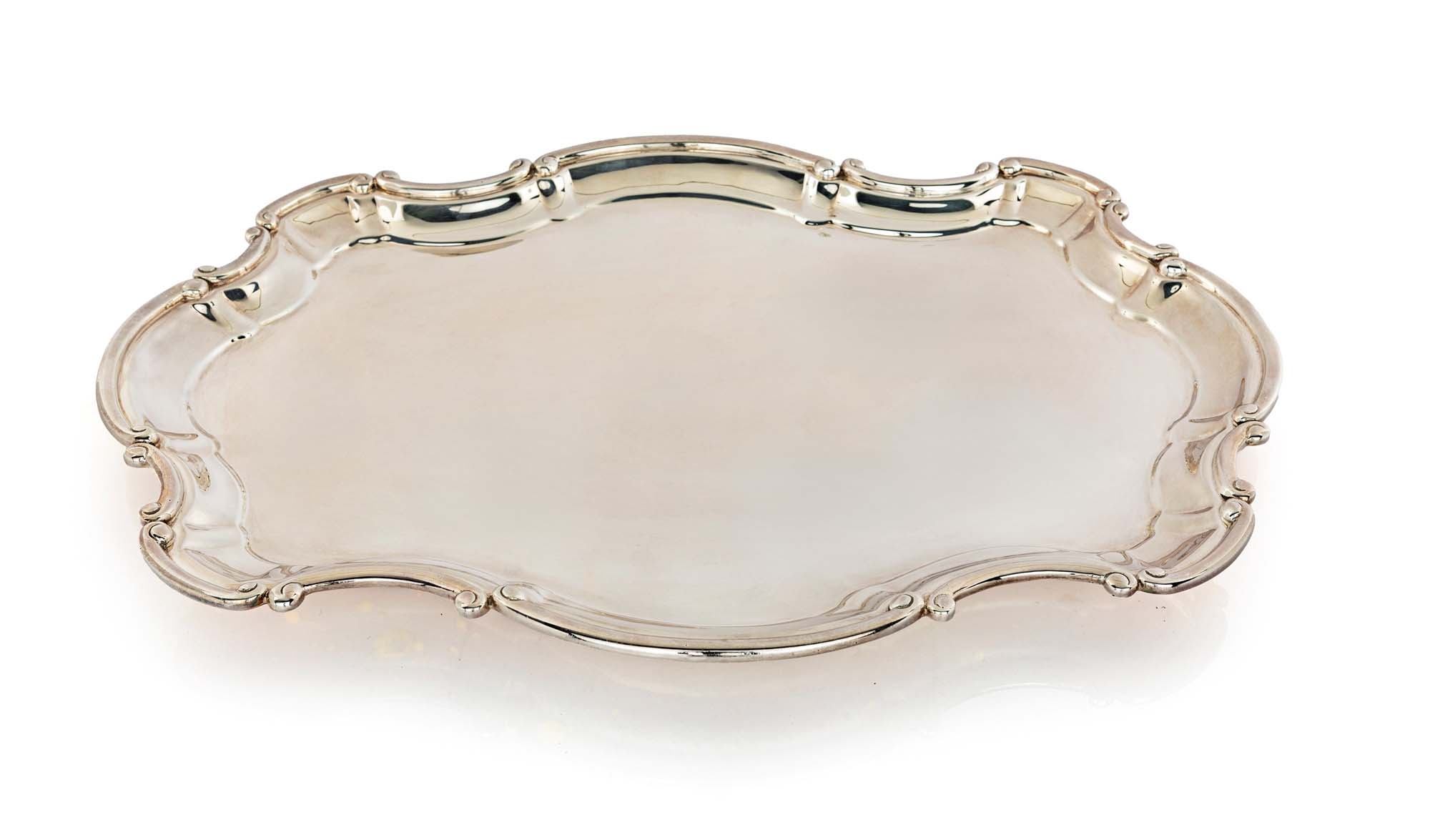 Vassoio sagomato in argento 925/000, Messulam Milano profilo curvilineo percorso da volute contrapposte in sequenza cm 44,5x33 - gr. 1252