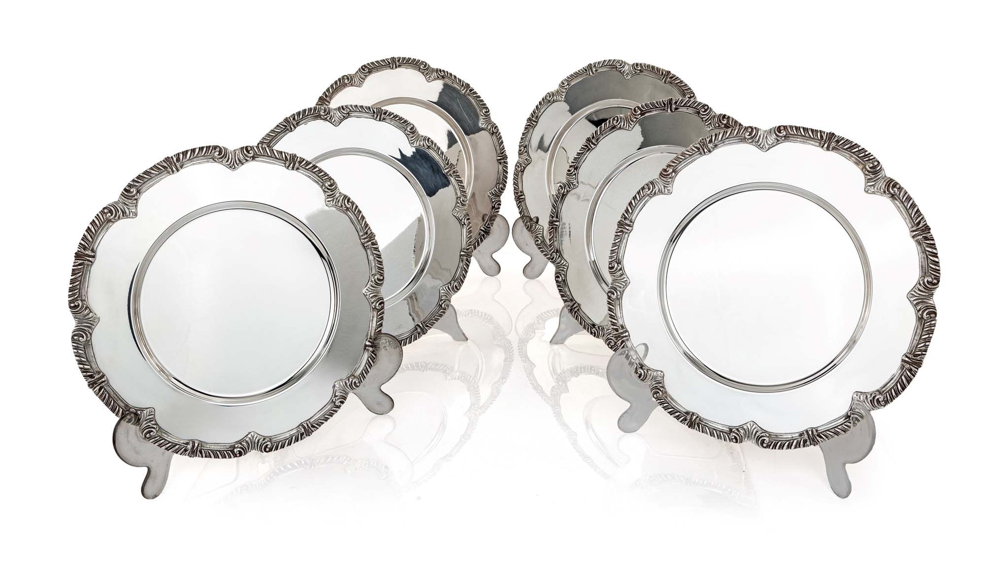 Sei sottopiatti in argento 925/000, Sandri per Bottega dell'Argento caratterizzati da orlo sagomato percorso da cartouches cesellate e motivi vegetali diametro cm 30,5 - peso complessivo gr. 5286 (gr. 880 ca. ognuno)