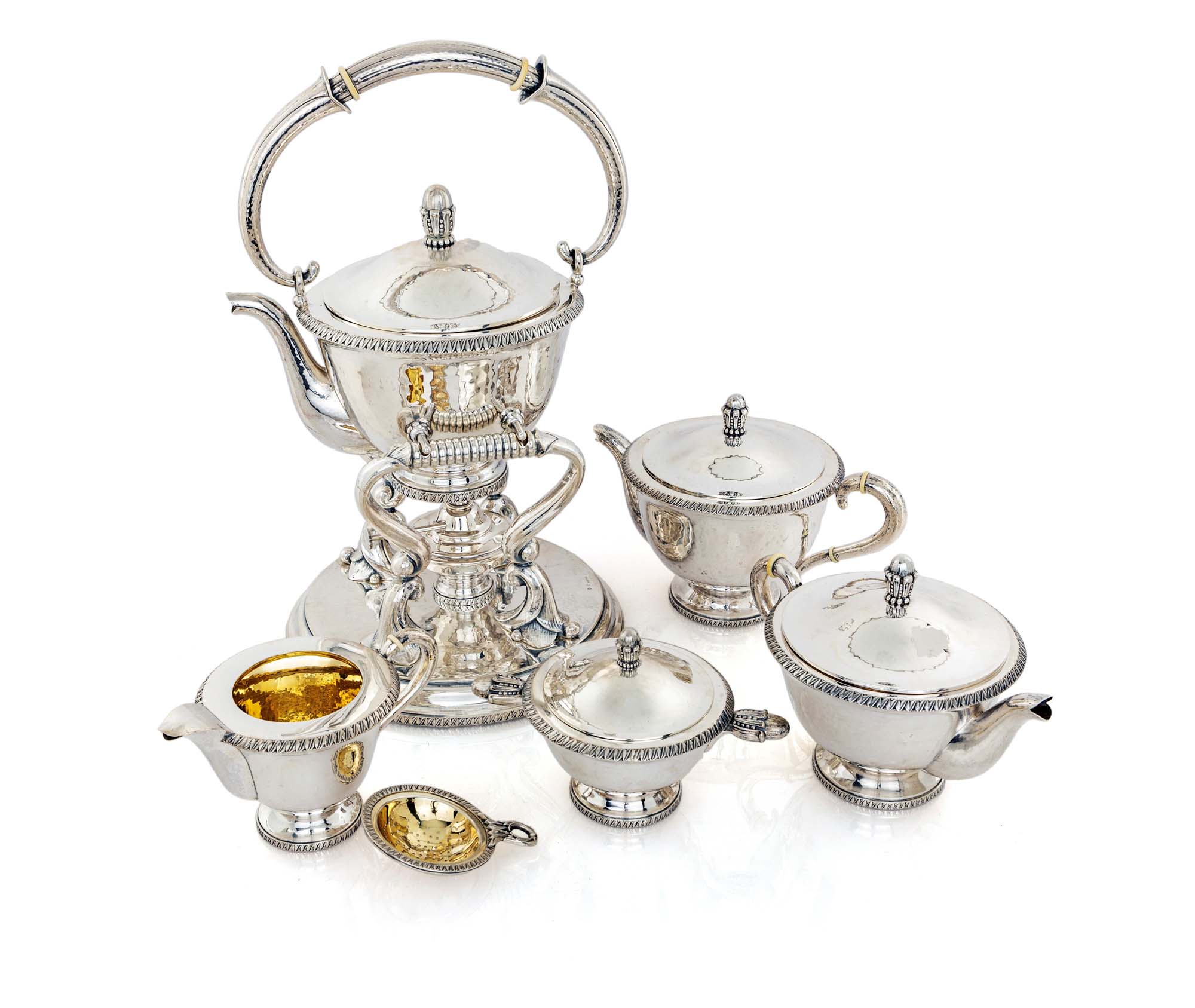 Servizio da tè in argento e in metallo argentato composto da cinque elementi due teiere di diversa misura con coperchio ed una terza con colino; zuccheriera biansata ed un bollitore con rechaud