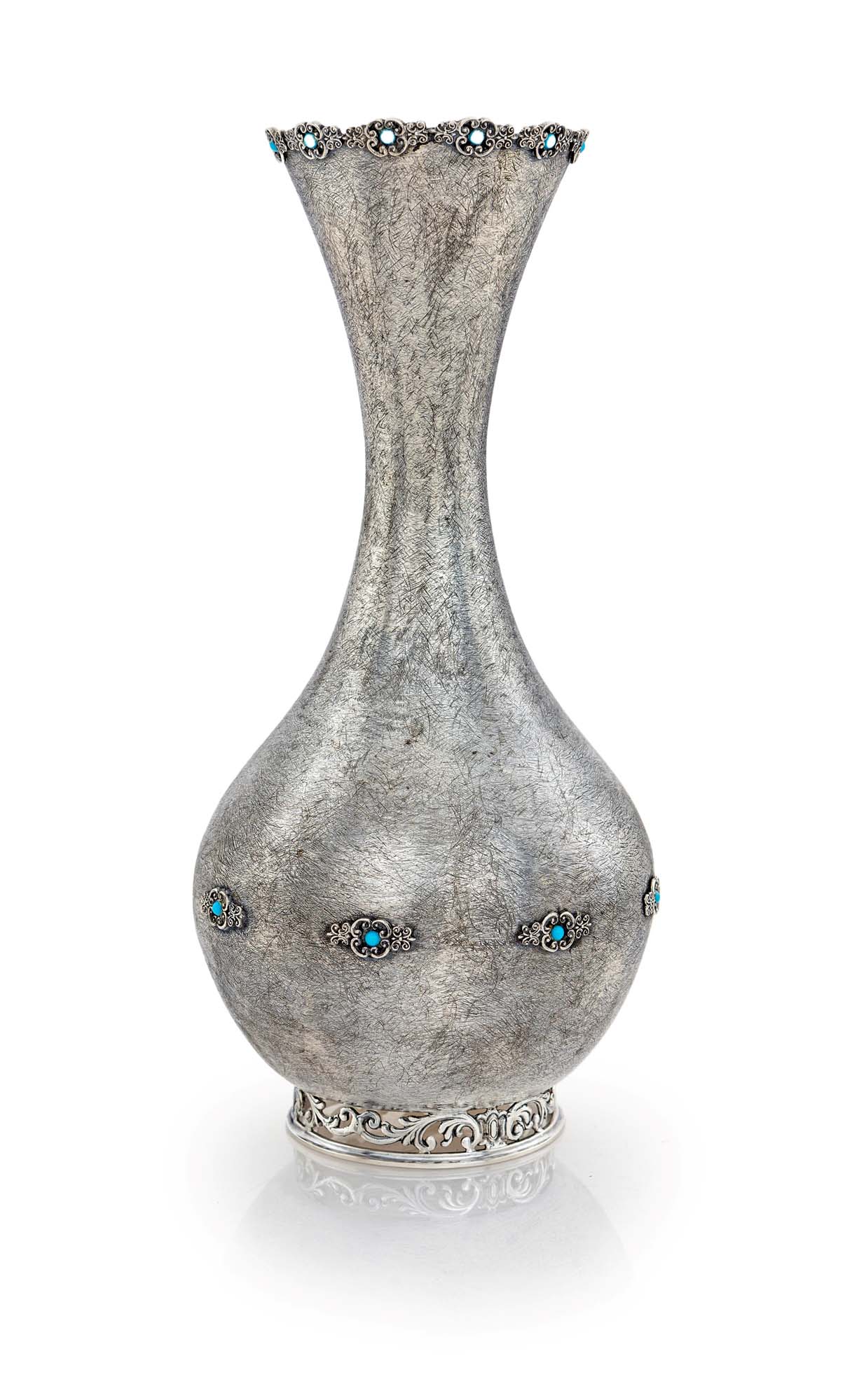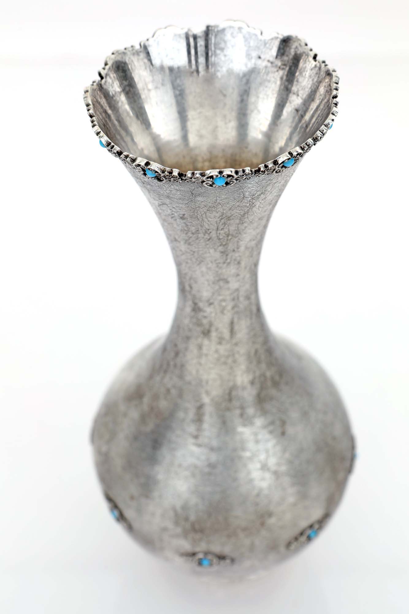 Piccolo vaso in argento a superficie satinata con piccoli turchesi altezza cm 22,5 - gr. 302