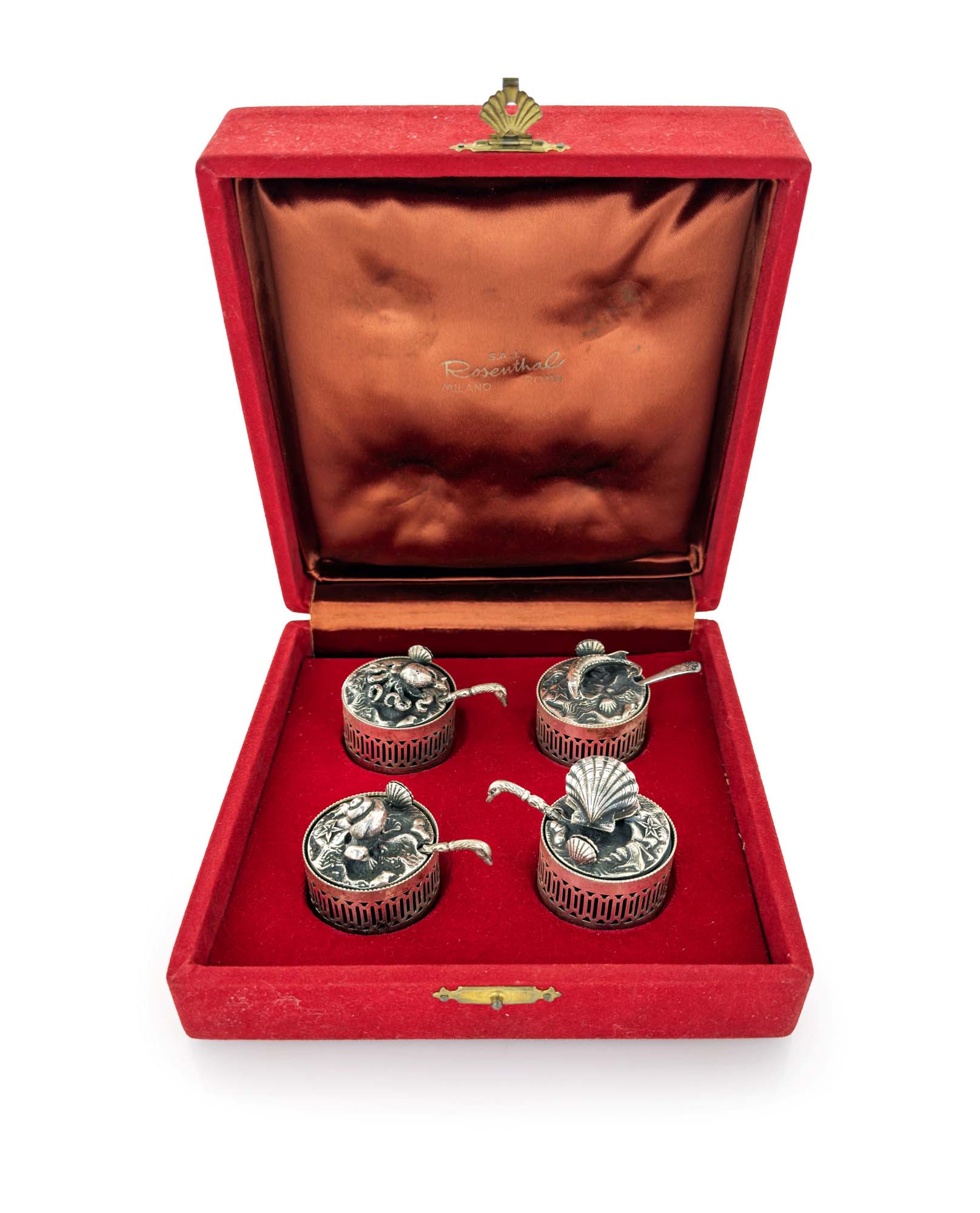 Quattro saliere in argento, Faccioli, Milano XX secolo di forma cilindrica traforata con contenitore interno in vetro blu e coperchio caratterizzato da una diversa composizione di elementi marini, ognuna con un elemento distintivo quale conchiglia, polpo, chiocciola e pesce. Complete di cucchiaino di cui tre con impugnatura a testa di anatra ed il quarto diverso cm 4,5x4 e cm 5,5 - peso complessivo gr. 200