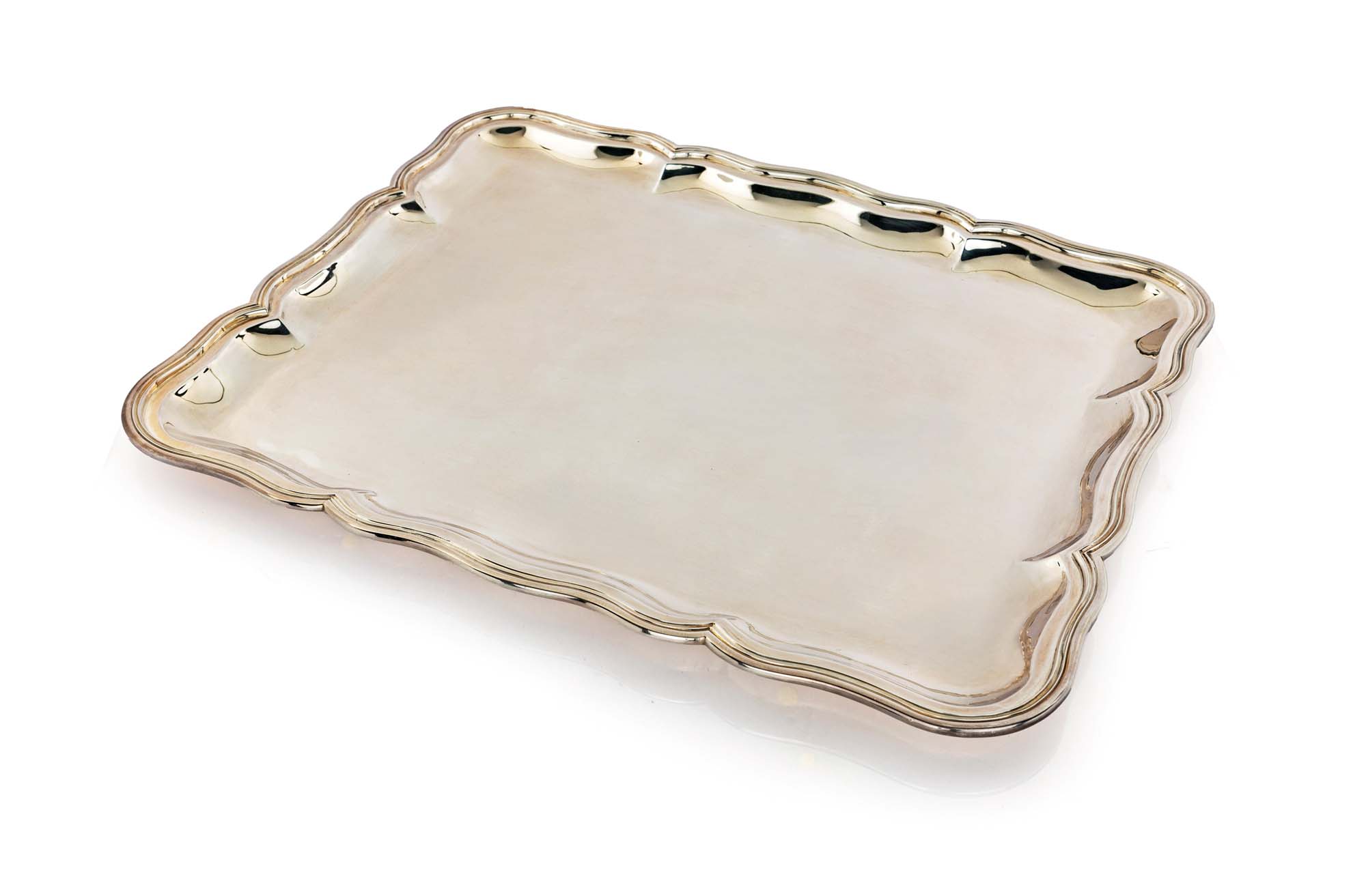 Vassoio rettangolare in argento 800/000 con angoli arrotondati ed orlo sagomato modanato cm 44,5x36 - gr. 1450