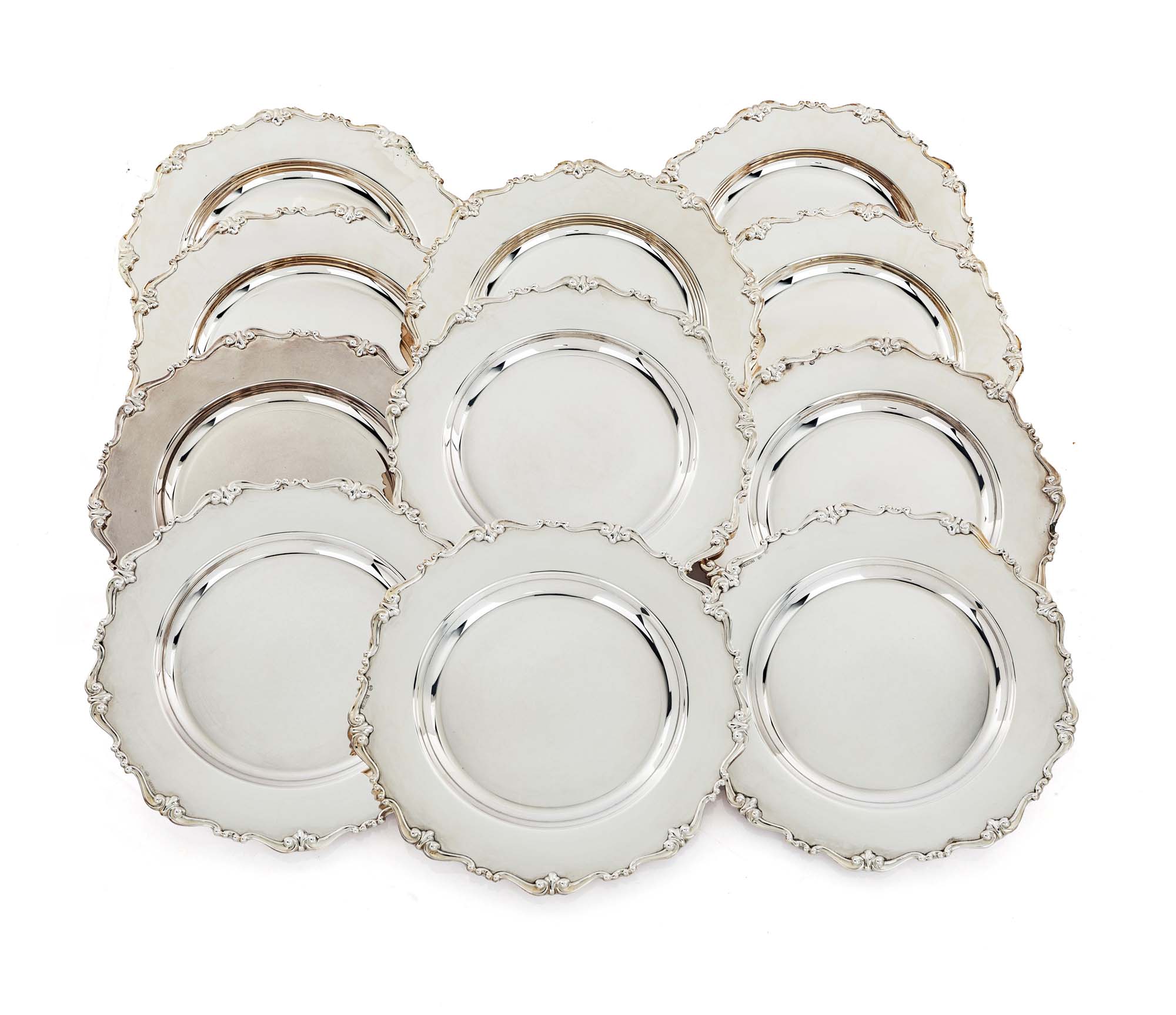 Undici piatti da dolce in argento 800/000, Frugoni orlo sagomato sottolineato da brevi volute contrapposte in sequenza alternate a motivi vegetali diametro cm 20 - peso complessivo gr. 1860