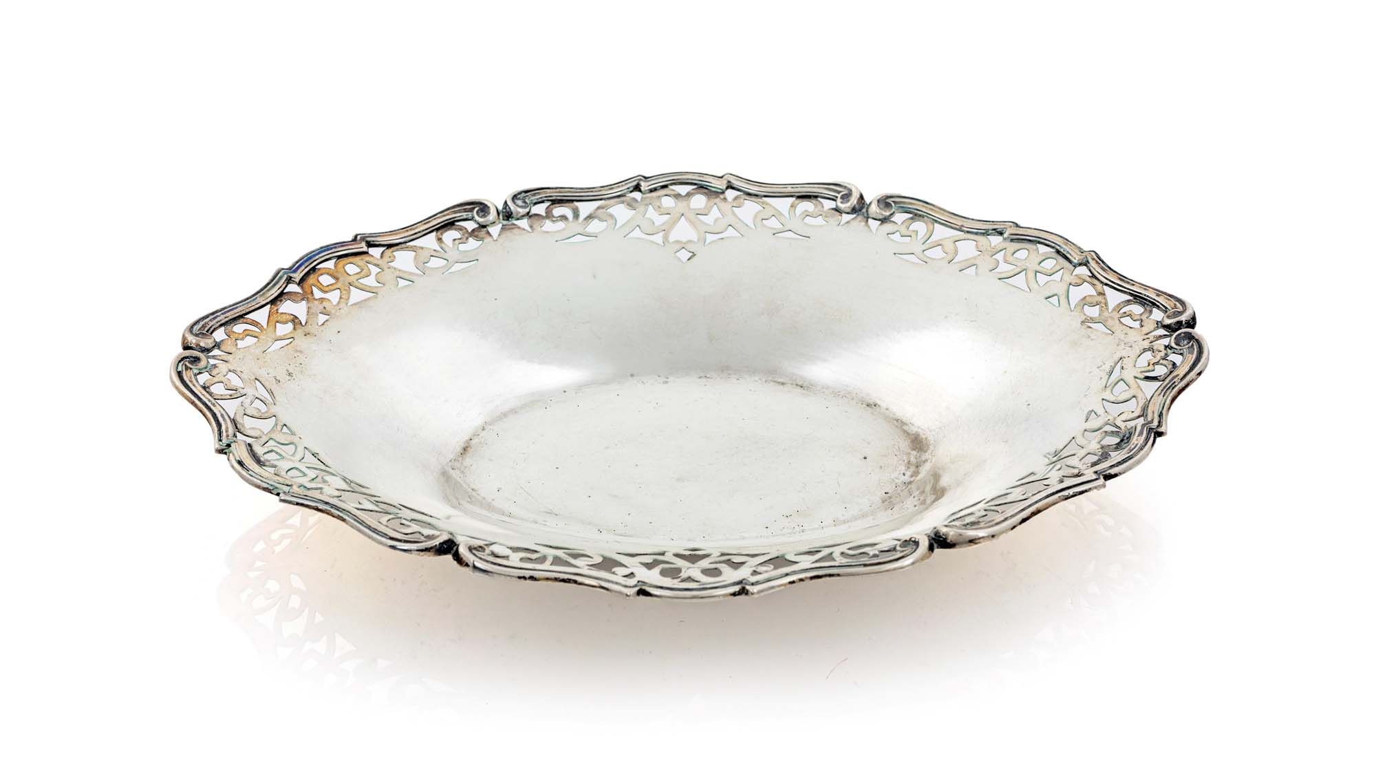 Cestino ovale in argento 800/000 tesa traforata racchiusa da orlo modanato...