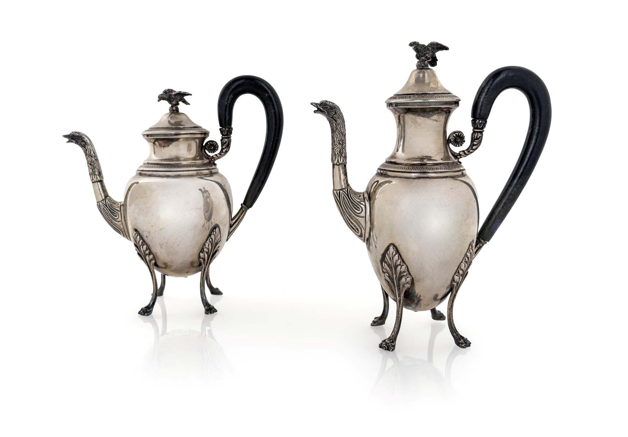 Due caffettiere stile Impero in argento 800/000 corpo a uovo sorretto da gambe arcuate con attacco a palmetta e piede ferino, decorato da due fasce a palmette poste alla base del collo e lungo il perimetro del coperchio; versatoio sagomato caratterizzato da beccuccio cesellato a testa di struzzo; coperchio a cupolino sormontato da un rapace; manico sagomato in legno ebanizzato altezza cm 21 e cm 23 - peso complessivo lordo gr. 982