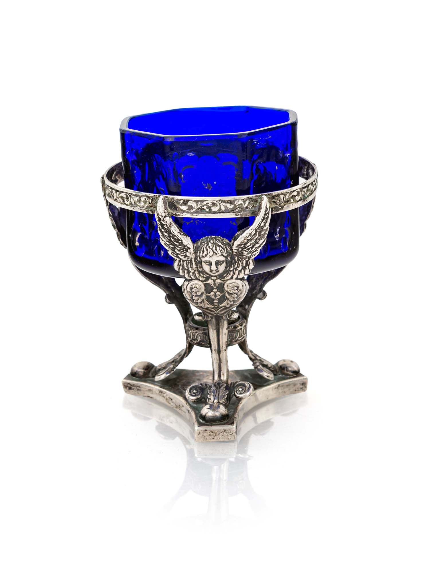 Saliera a tripode, Roma XIX secolo sostegni cesellati in forma di cherubino; base trilobata; contenitore in vetro blu a pianta ottagonale non pertinente cm 9,5x6,5 - gr. 54