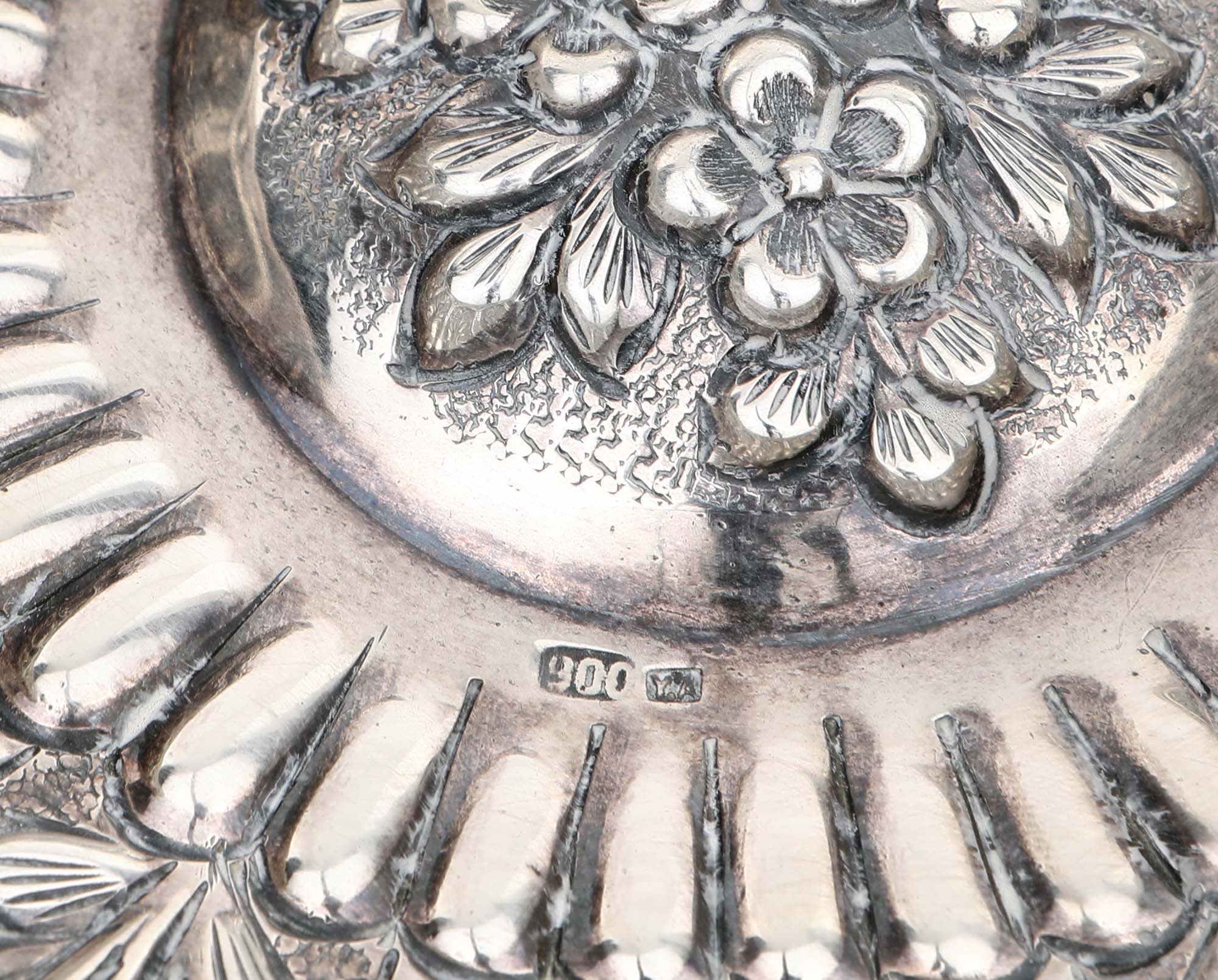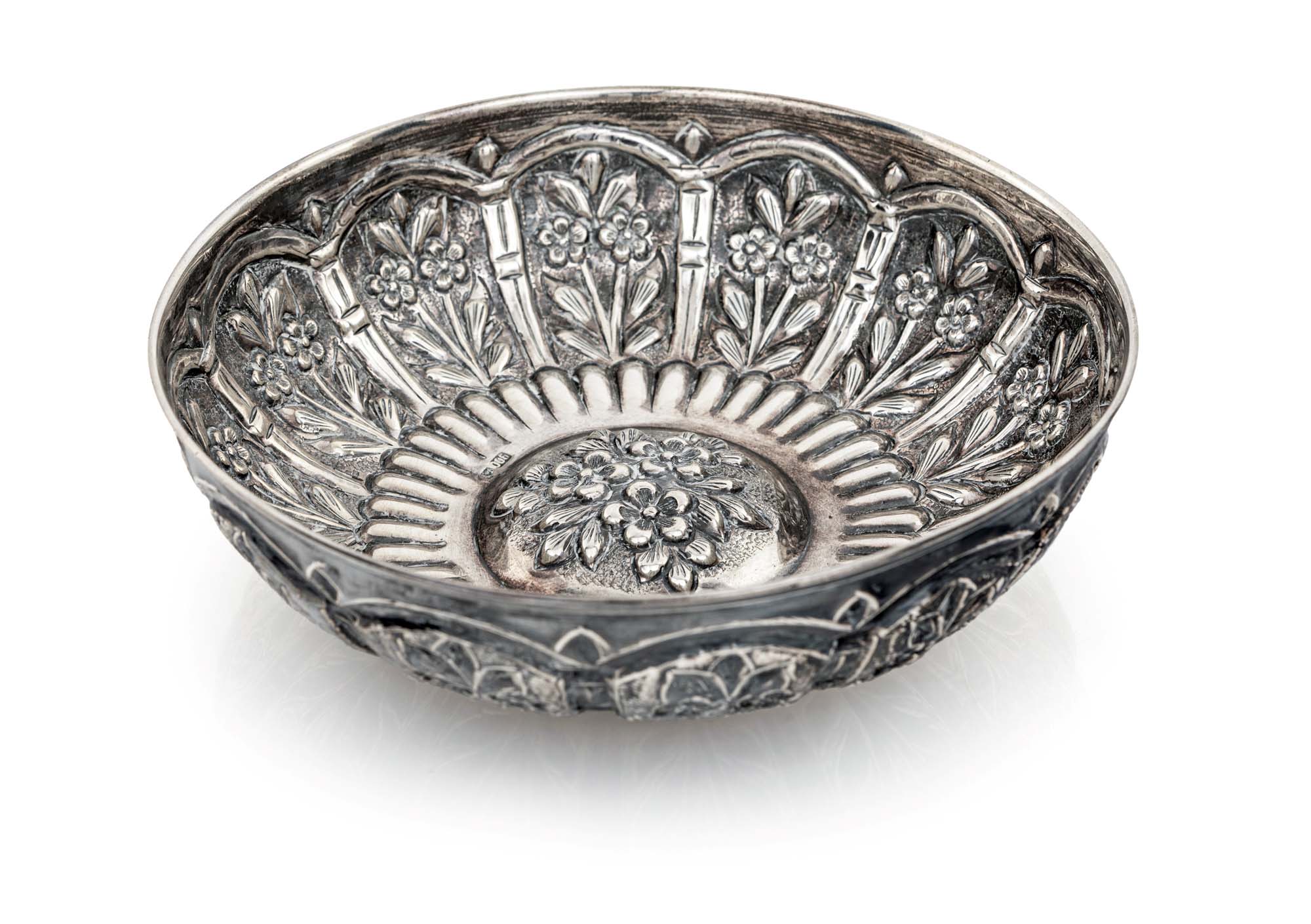 Coppetta sbalzata in argento 900/000 umbone convesso decorato da una composizione di fiori, tutt'intorno baccelli e rami fioriti entro nicchie centinate 5x16,5 - gr. 210
