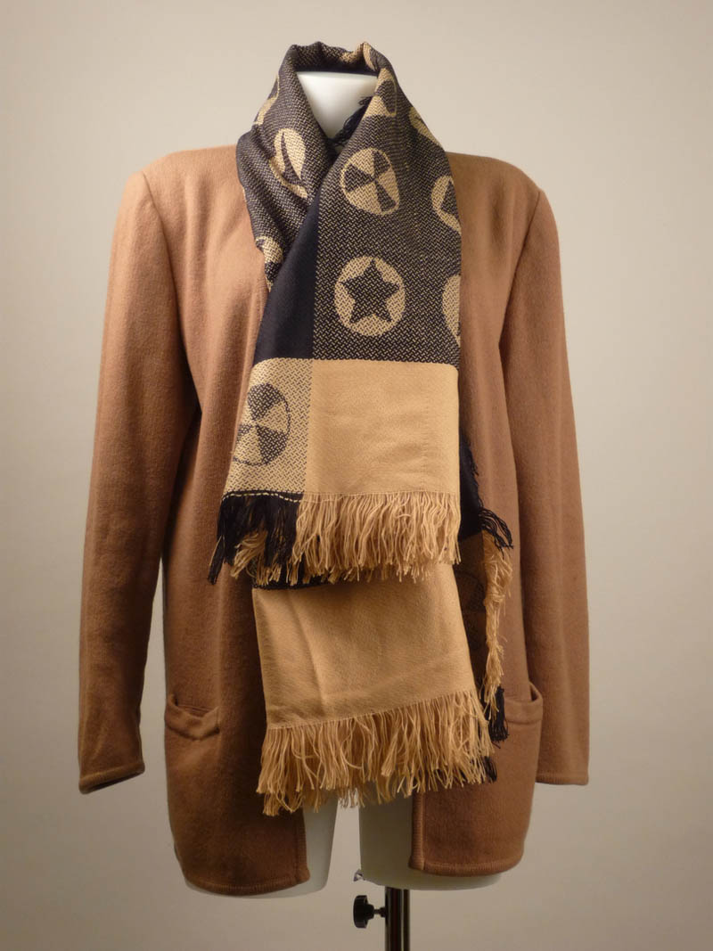 LOTTO - LOT un cardigan in lana nocciola e una sciarpa ampia, Fendi, con motivi nei toni del nocciola e del nero (2)