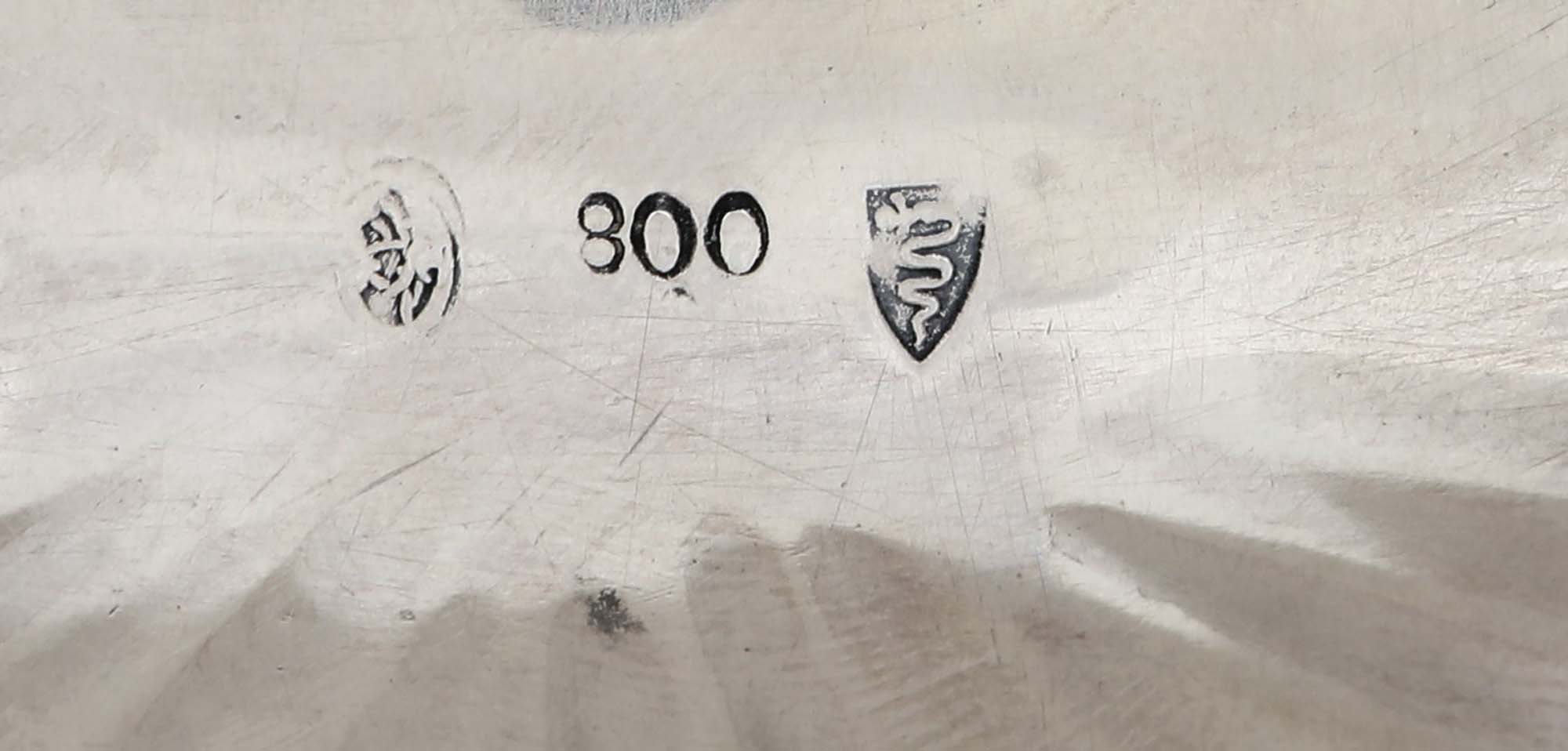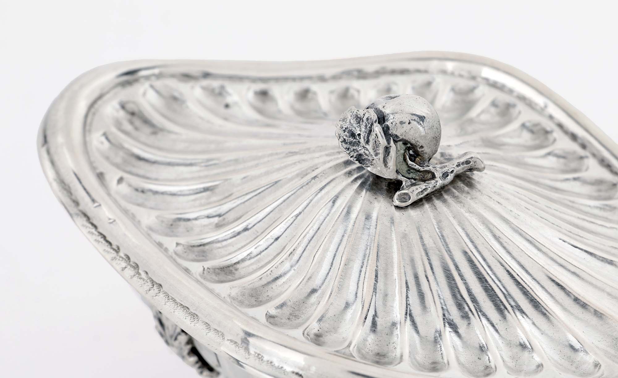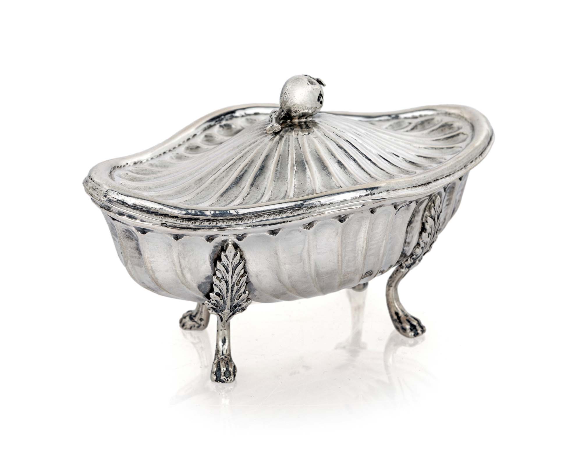 Zuccheriera ovale con coperchio sormontato da un frutto piedi ferini con attacco a palmetta. Bollo fascio