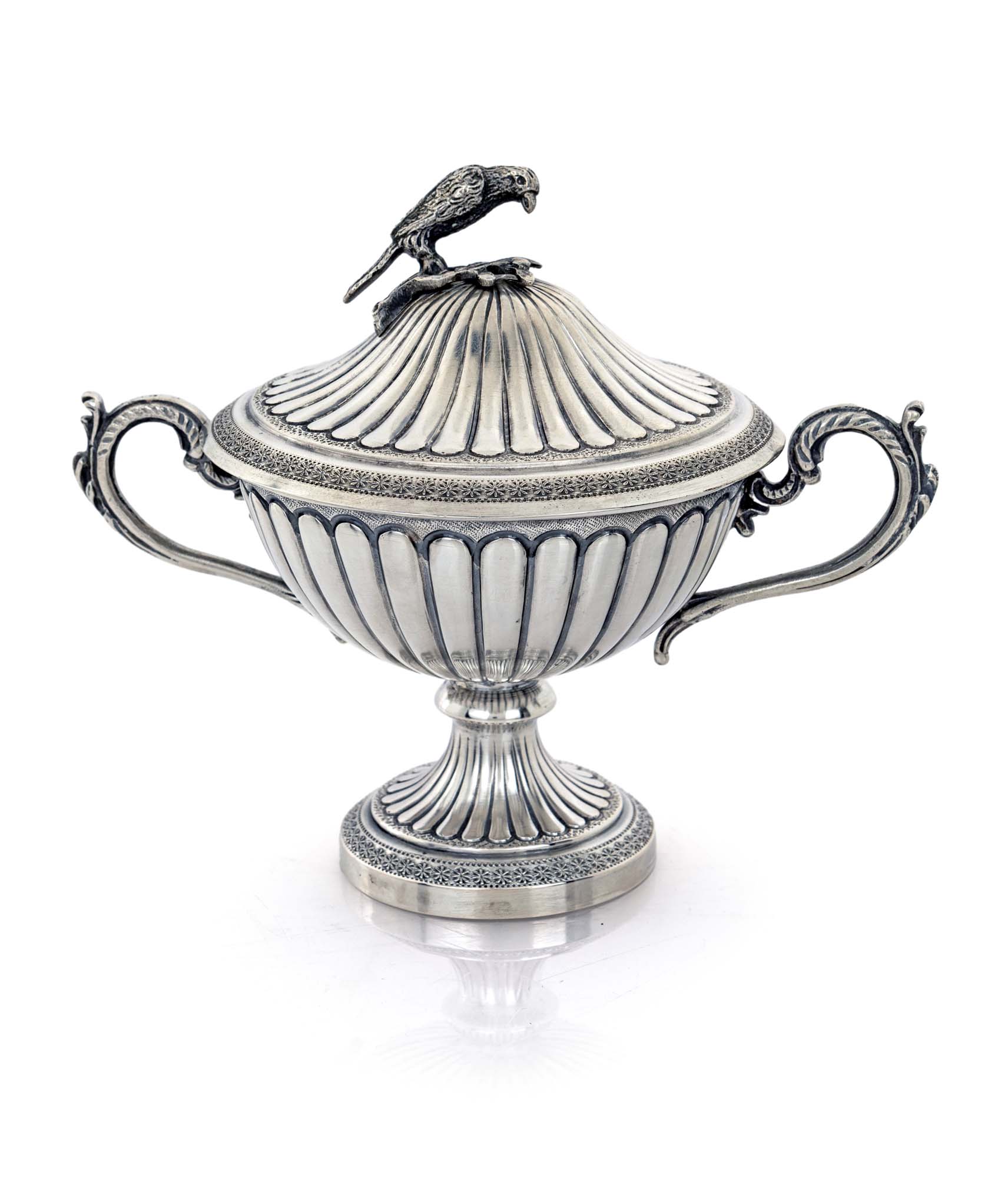 Zuccheriera biansata con coperchio a forma di coppa sormontata da figura di pappagallo; piede circolare cm 15x18x11,5 - gr. 360